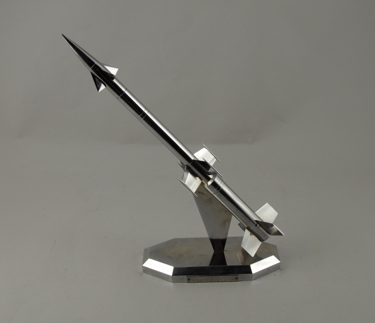 MAQUETTE de MISSILE MASURCA en acier chromé. Le socle à pans coupés porte un cartel marqué "FONDERIE DE RUELLE / Sous Direction Engins Spéciaux". Elle est conservée dans son coffret en bois gaîné de velour vert.