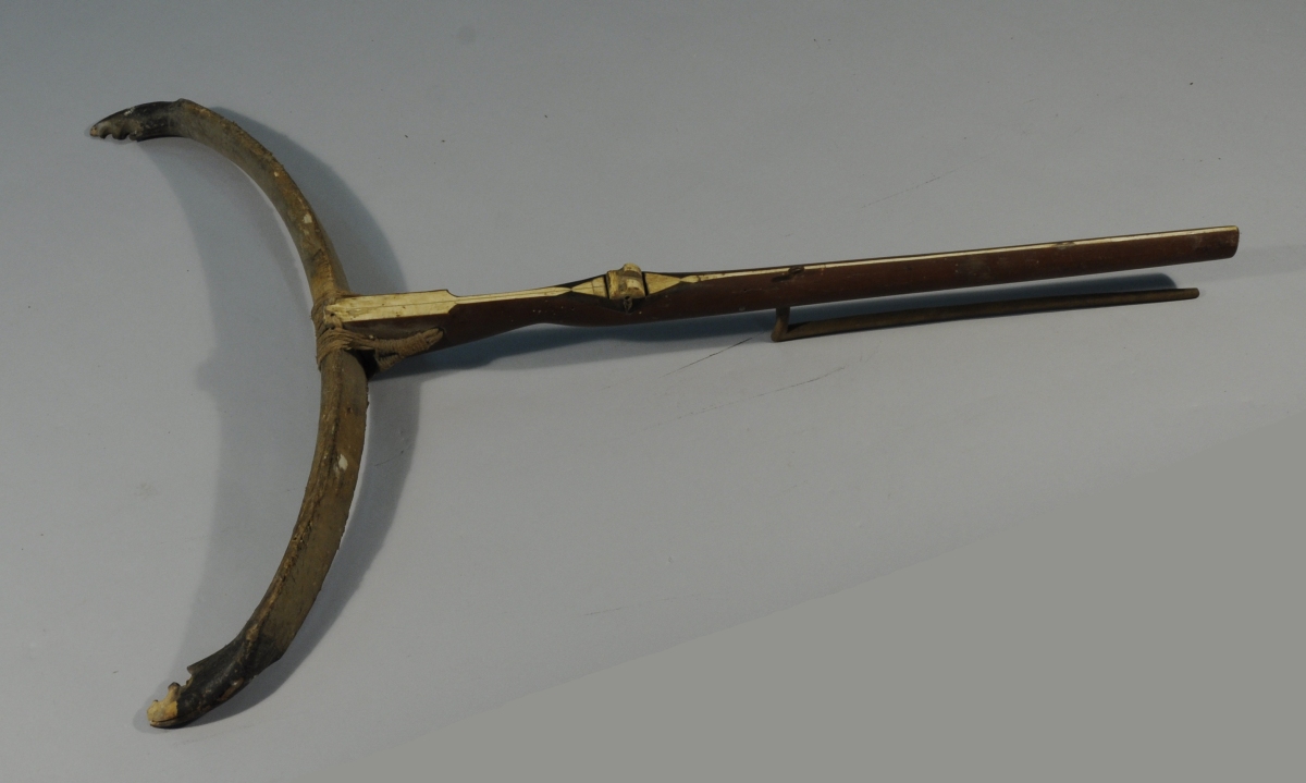 ARBALÈTE composite en acajou et incrustations d'os et de corne.