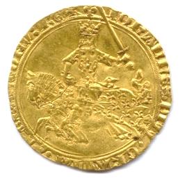 Le roi à cheval galopant à gauche brandissant son épée. Il est coiffé d'un heaume couronné. Sa cotte de mailles et le caparaçon du cheval sont ornés de fleurs de lis.