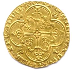 R/. Croix fleuronnée dans un quadrilobe feuillu cantonné de quatre trèfles.