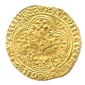 R/. Croix aux bras fleurdelisés dans un quadrilobe orné de fleurs de lis et cantonné de couronnelles. Ponctuation par étoiles. Etoile pointée au centre. Apostrophes après XPC. Premier P pointé.