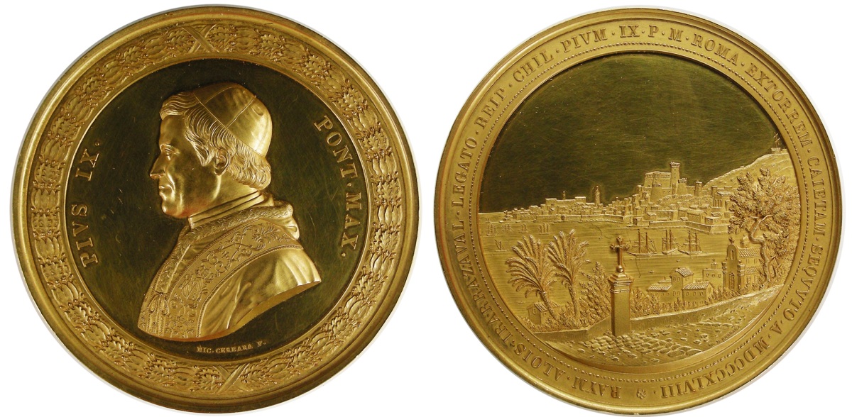 Médaille en or, uvre du graveur Nicola Cerbara (1796-1869), sur l'avers est figuré le Souverain Pontife en buste à gauche signé NIC. CERBARA F., encadré de la légende PIVS IX. PONT. MAX. ceinte d'une couronne de feuilles de chêne et de laurier fruitée nouée en haut et en bas ; le revers présente une vue perspective de la ville et du port de Gaëte signée N. CERBARA, entourée de l'attribution frappée en relief RAYM. ALOIS. IRRAZAVAL. LEGATO. REIP. CHIL. PIVM. IX. P. M. ROMA. EXTORREM. CAIETAM. SEQVVTO. A. MDCCXLVIII.