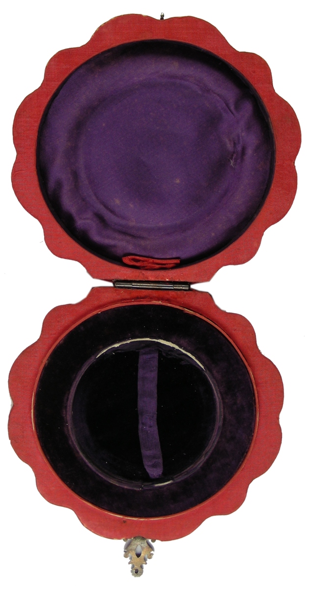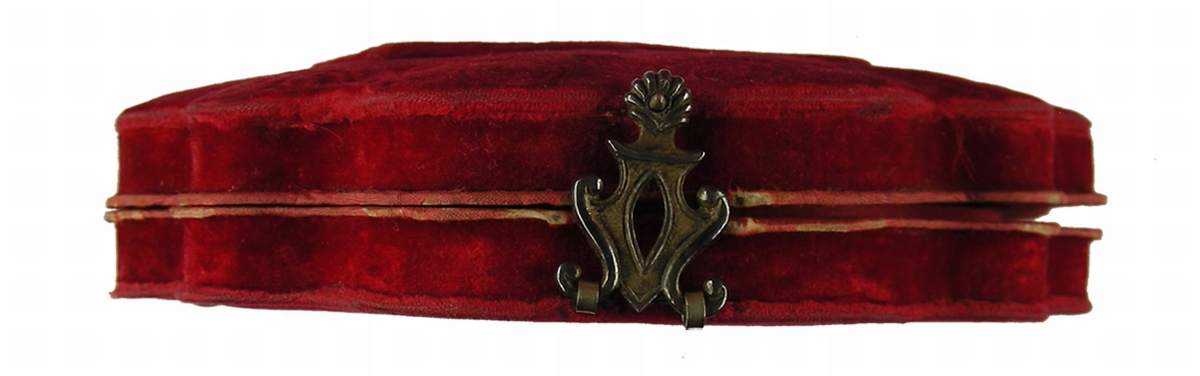 Dans un écrin de forme mouvementée, recouvert de velours pourpre, le couvercle gaufré de motifs rocaille et frappé aux armes de Pie IX, fermoir en argent terminé en coquille, intérieur gainé de satin et de velours violet, en dessous, une petite étiquette en cuir porte l'adresse du gainier frappée à l'or, in Roma via del Gesu N 68.