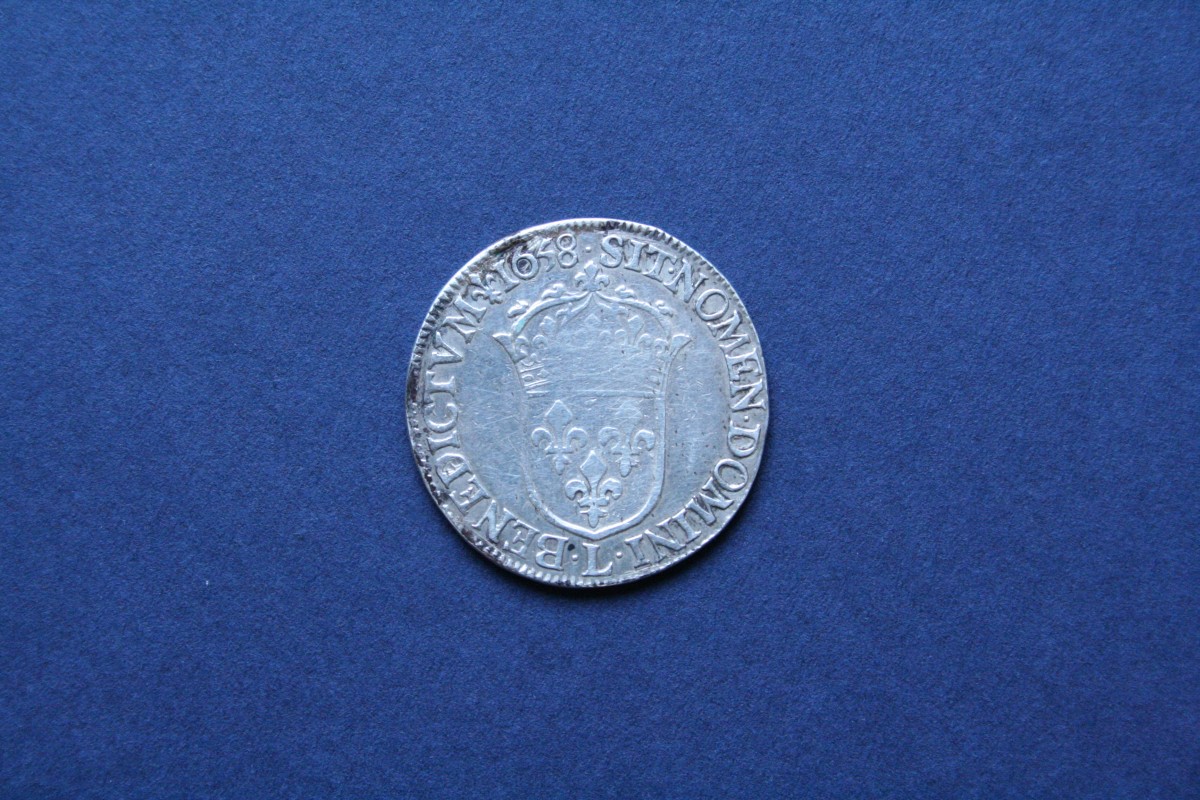 France : Louis XIV (1643-1715), demi écu à la mèche longue, 1658, L=Bayonne à la pointe de l'écu de revers, un fleur de lys différent du Maître de la Monnaie de Bayonne Dutost, avant la date. 2900 exemplaires seulement de cette rare monnaie auraient été frappés selon F. Droulers. Dr . 527, D. 1470 TTB