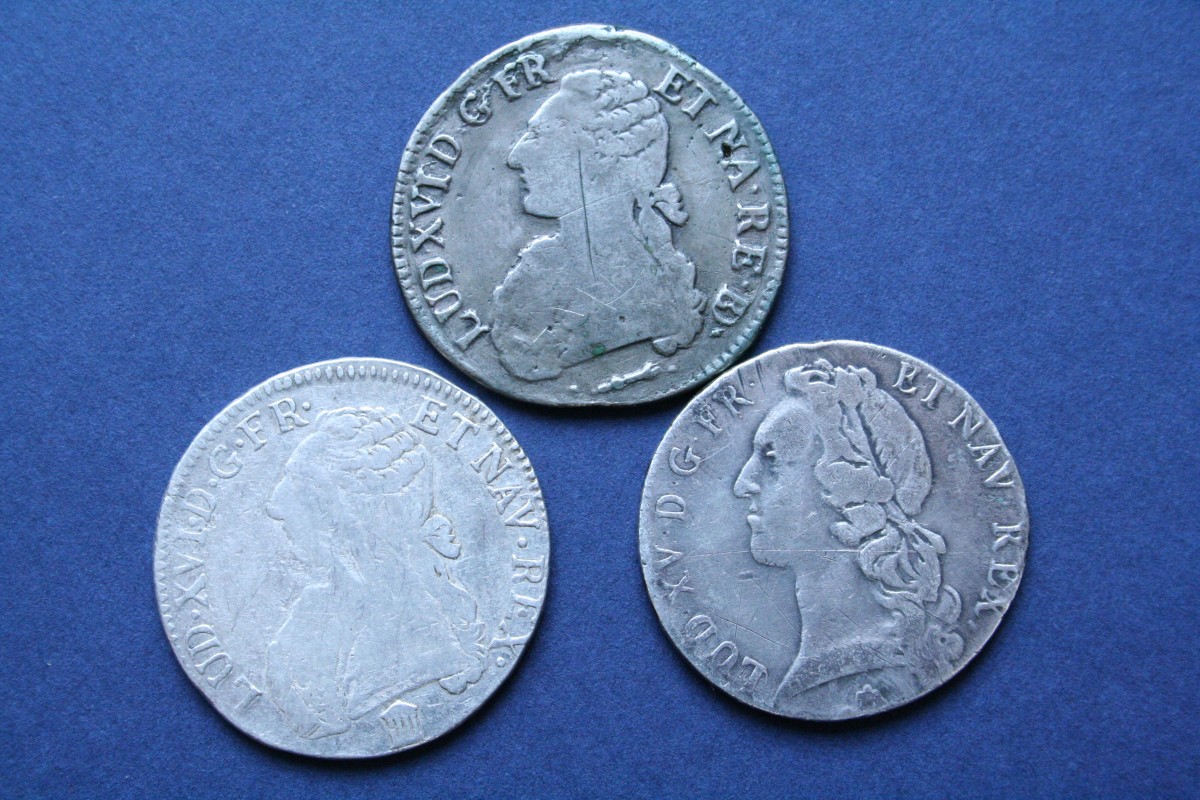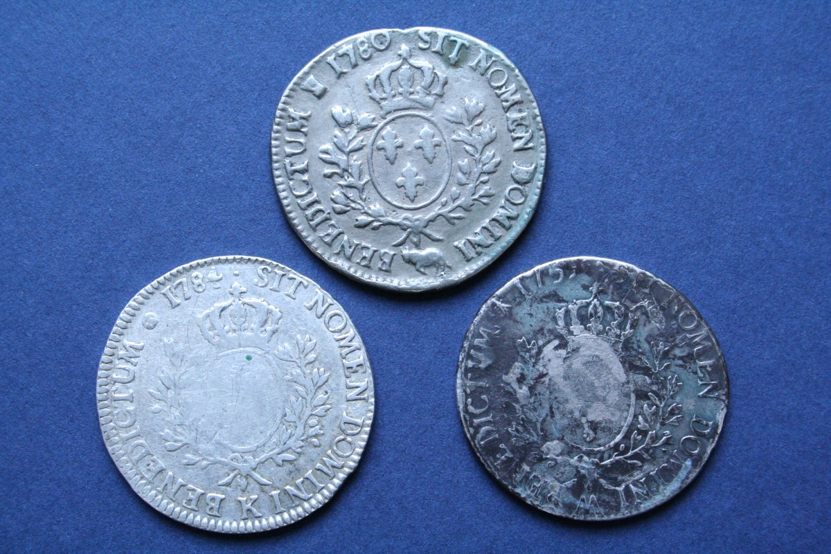 Lot, France, 3 écus , 1 Louis XV 1759, AA=Metz, 2 de Louis XVI, 1780 vachette= Pau, un autre 1784, K=Bordeaux D. 1680, 1708 TB