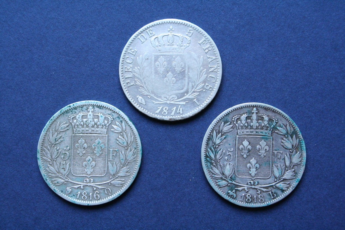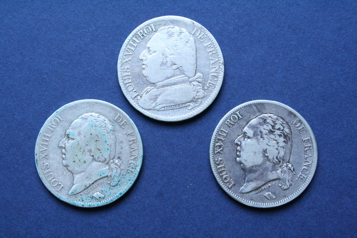 Lot, France, Louis XVIII, 3 pièces de 5 F, 1) 1814, I=Limoge, 2) 1816, Q=Perpignan, 1818, B=Rouen F. 308-6, 309-11 et 29 TB/TTB