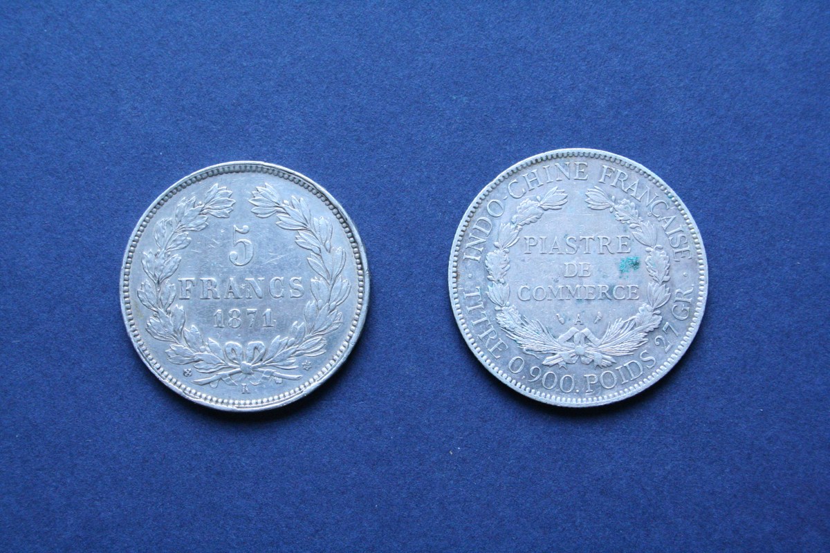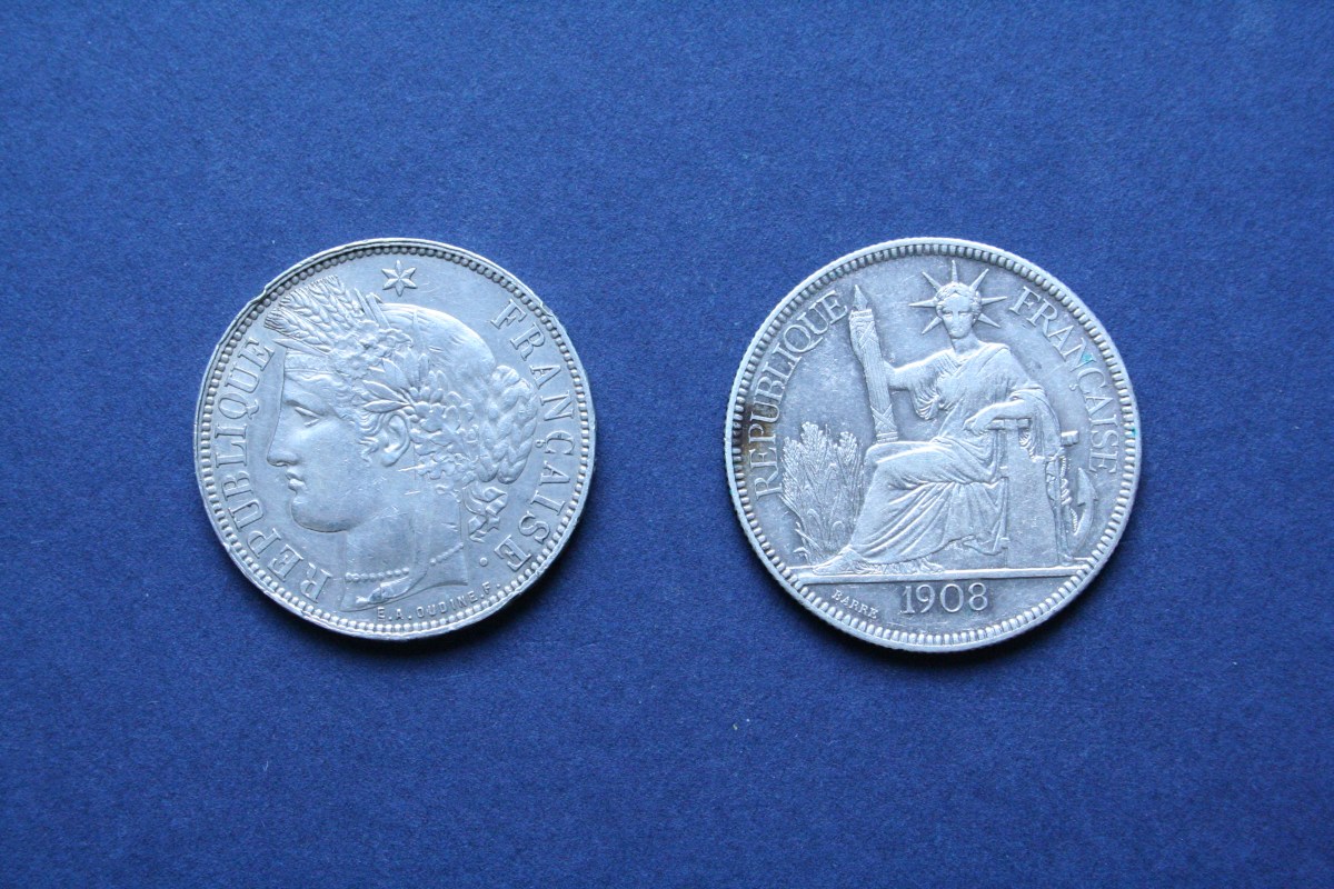 Lot, France et Indochine, 2 pièces en argent, 5 F type Cérès, 1871, K=Bordeaux et 1 piastre de commerce, 1908 TTB+