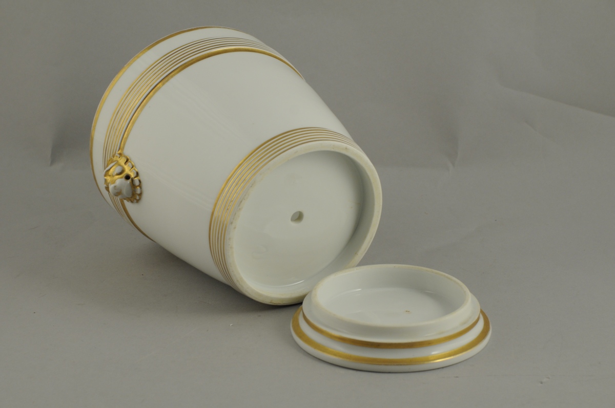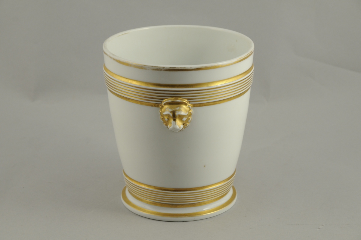 CACHE-POT en porcelaine blanche rehaussée de filets or. Deux anses en têtes de lions or. Socle circulaire. XIXème. Haut. 20,3 cm. (usures à l'or)