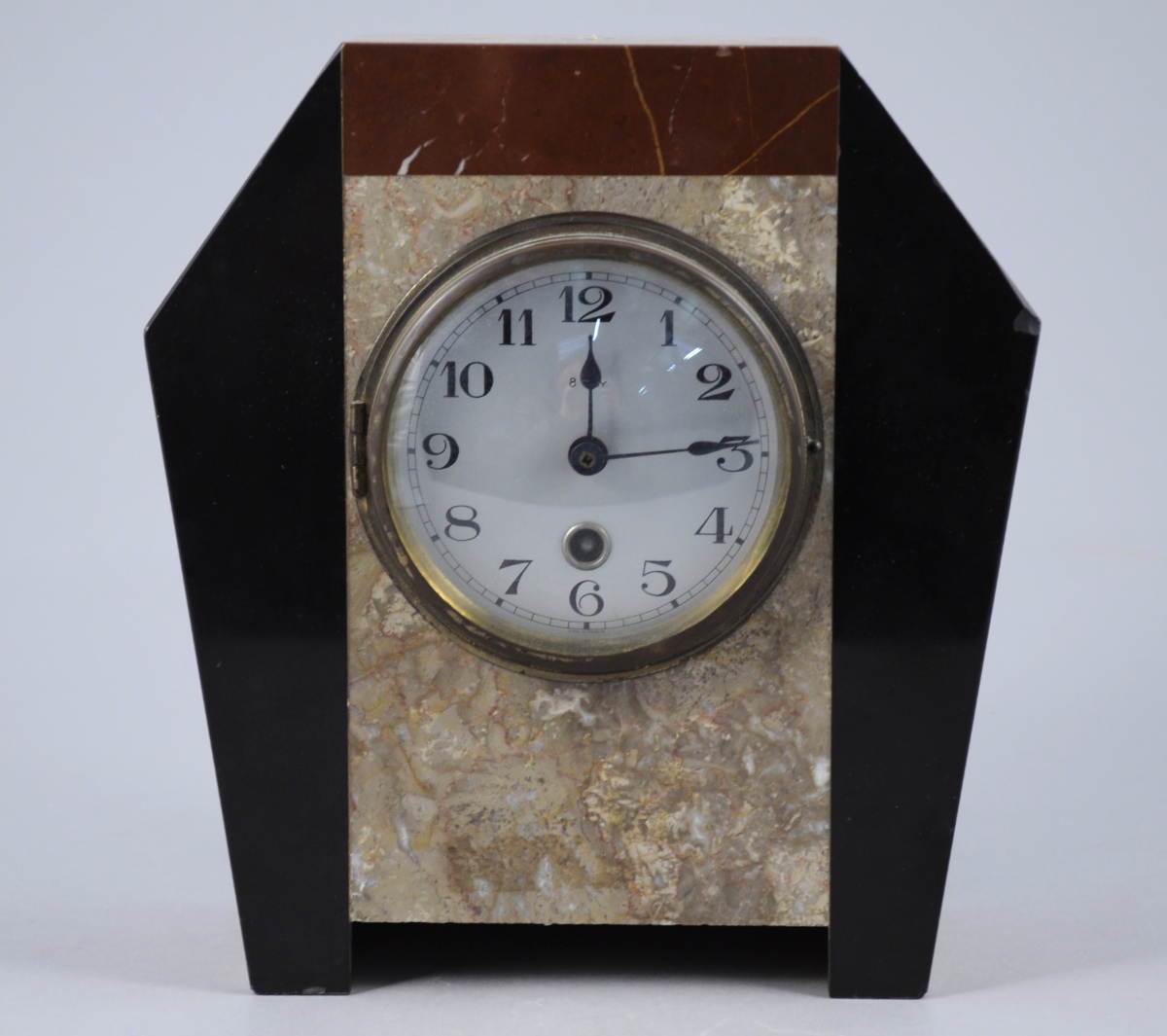 PENDULE BORNE en marbre gris, noir et rouge à angles coupés. Cadran circulaire indiquant les heures en chiffres arabes.