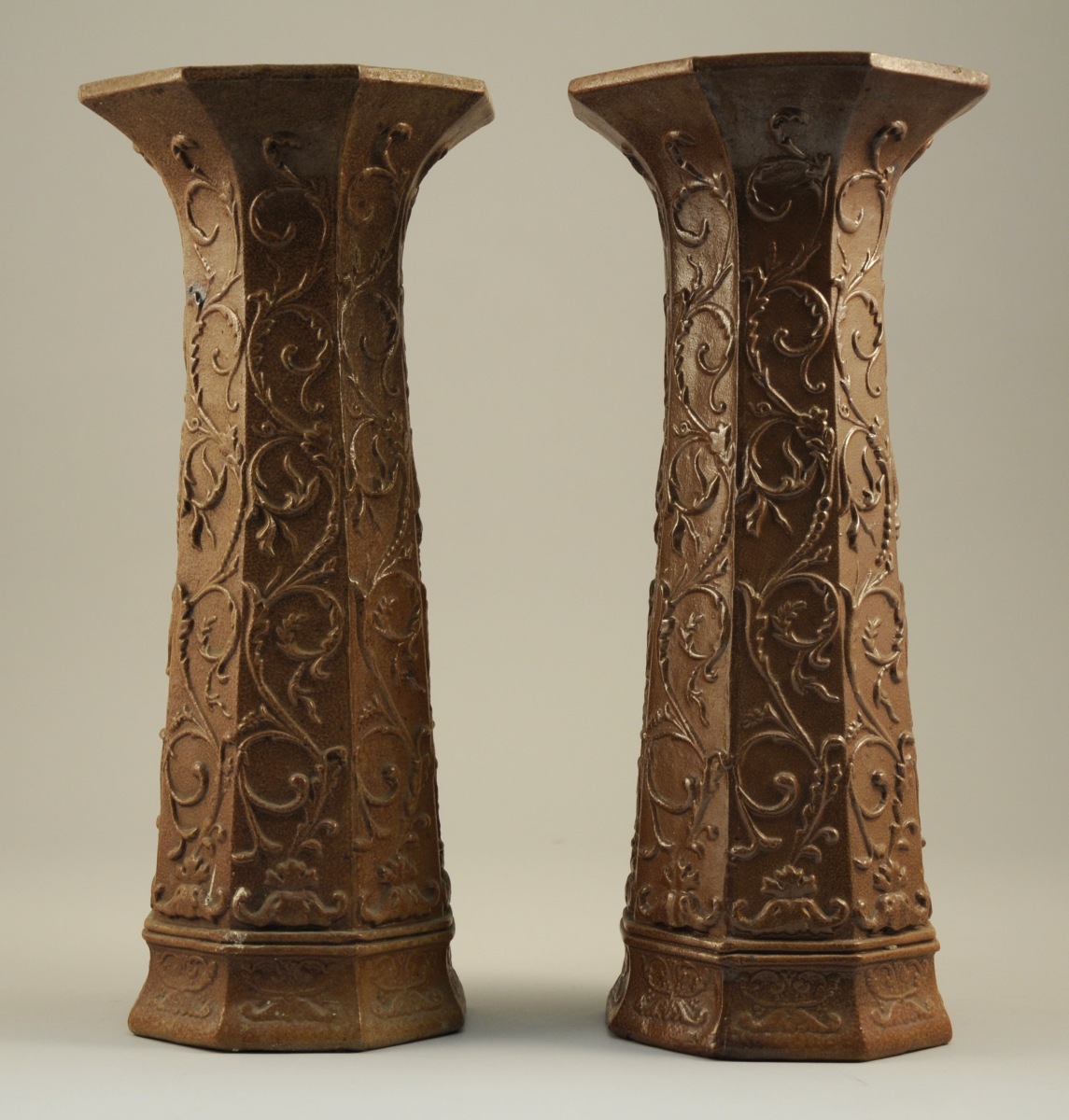 Paire de VASES cornets en grès octogonaux. Couverte tabac. Décor de rinceaux feuillagés.