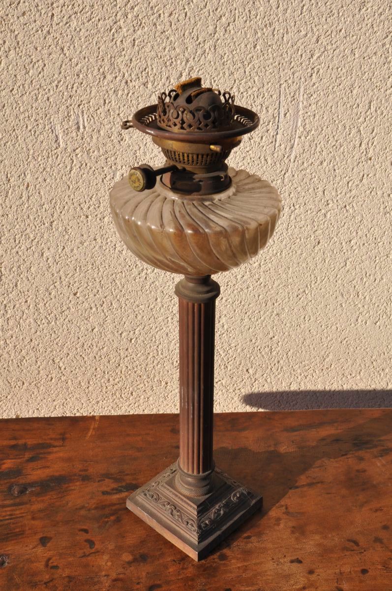 -LAMPE à pétrole à double mèches. Le fût cannelé et la base carrée orné de volutes en laiton. Le réservoir en verre formé de godrons rayonnants. XIXème. Haut. 51 cm.