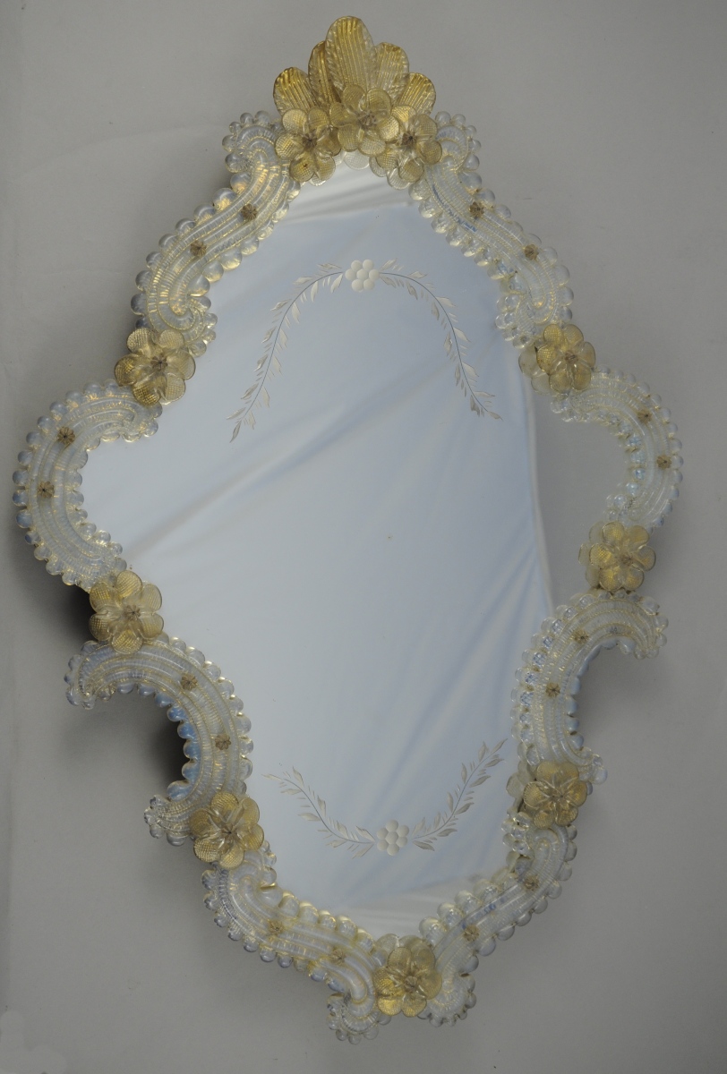 MIROIR à bords chantournés constitués d'éléments en verre de Venise opalescents tels que agrafes, volutes, fleurs et languettes quadrillées et dorées. La glace est gravée de tiges feuillagées centrées d'une fleur. Travail contemporain. Haut. 68, Larg. 47 cm.