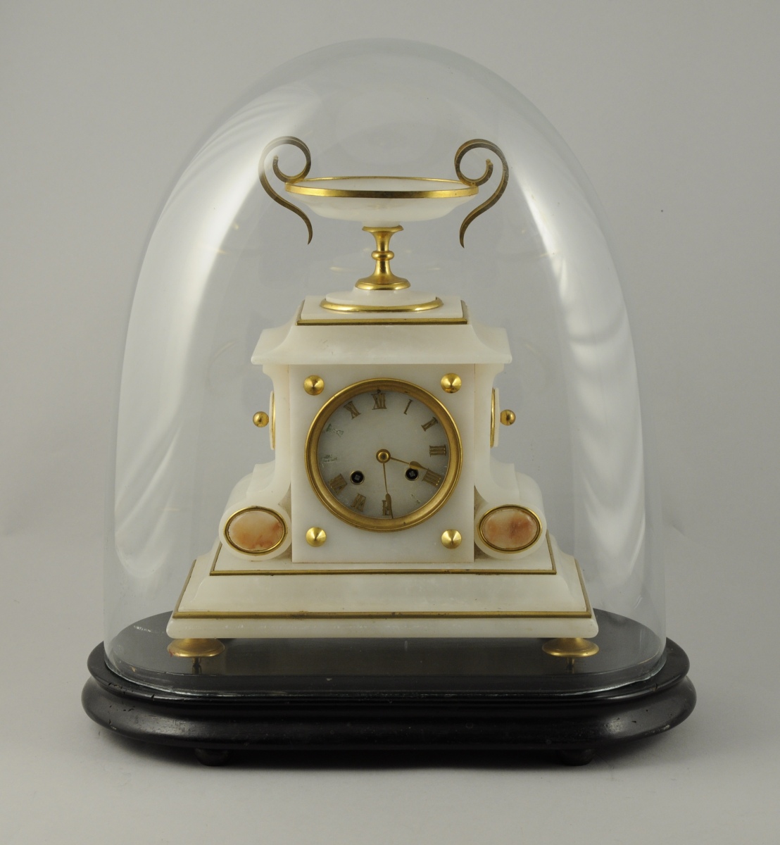PENDULE en marbre blanc et bronze doré. Cadran à chiffres romains, reposant sur une terrasse quadrangulaire à doucine, et sommé d'un vase d'ornement. Socle de bois noirci et globe de verre. Début XXème.