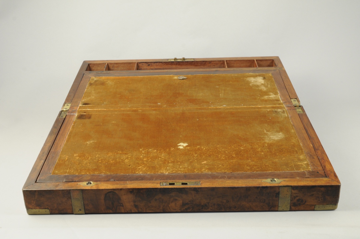ÉCRITOIRE en placage de ronce de noyer et garnitures de laiton. Elle découvre un intérieur garni de velours jaune, avec des compartiments à encre et plumes.