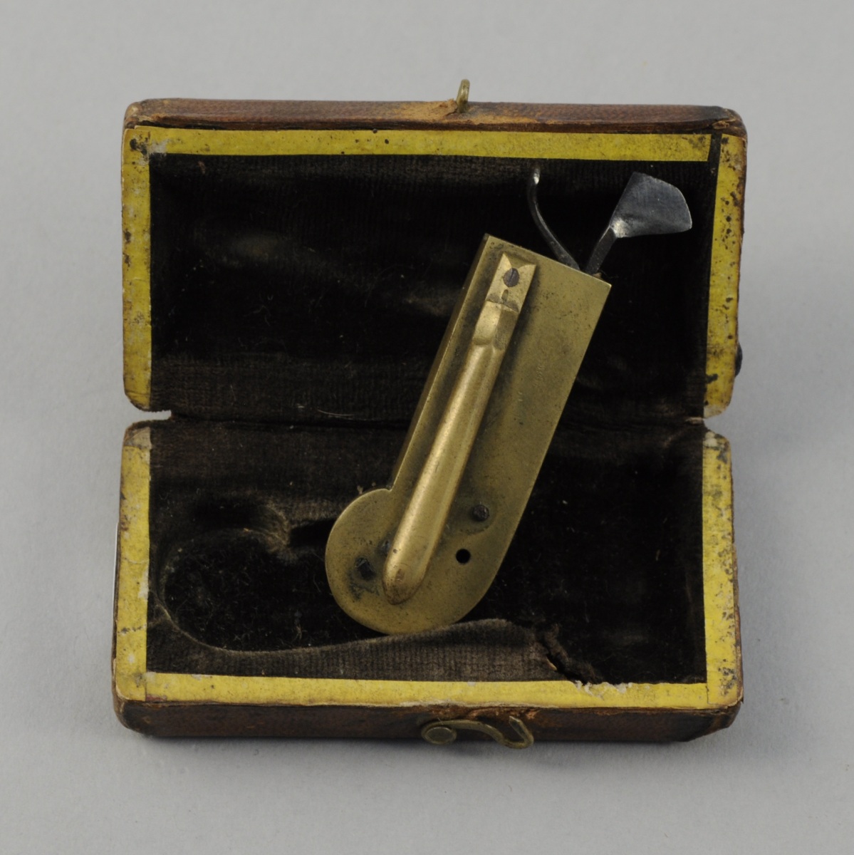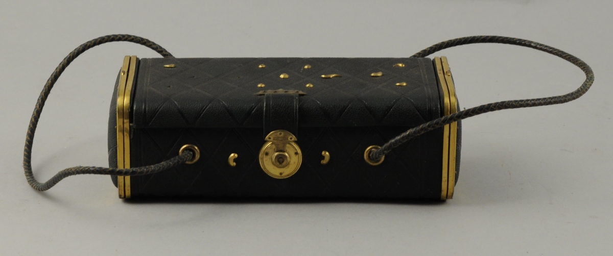 COFFRET de forme oblongue en cuir et carton à l'imitation du cuir et orné d'éléments en laiton contenant un nécessaire à couture imcomplet conservant divers éléments en os, métal et bois. Chaque extrémité dissimule de petits compartiments gaînés de toile rouge. Il se porte avec l'aide de deux anses en cuir tressé.