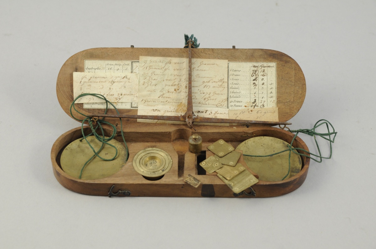 BALANCE DE CHANGEUR, et ses masses, en acier poli avec fléau à bras égaux dont le point d'appui est constitué d'un couteau central. Aux extrémités du fléau sont suspendus deux petits plateaux en laiton destinés à peser les pièces de monnaie. Le tout dans un coffret de forme oblongue en noyer.
