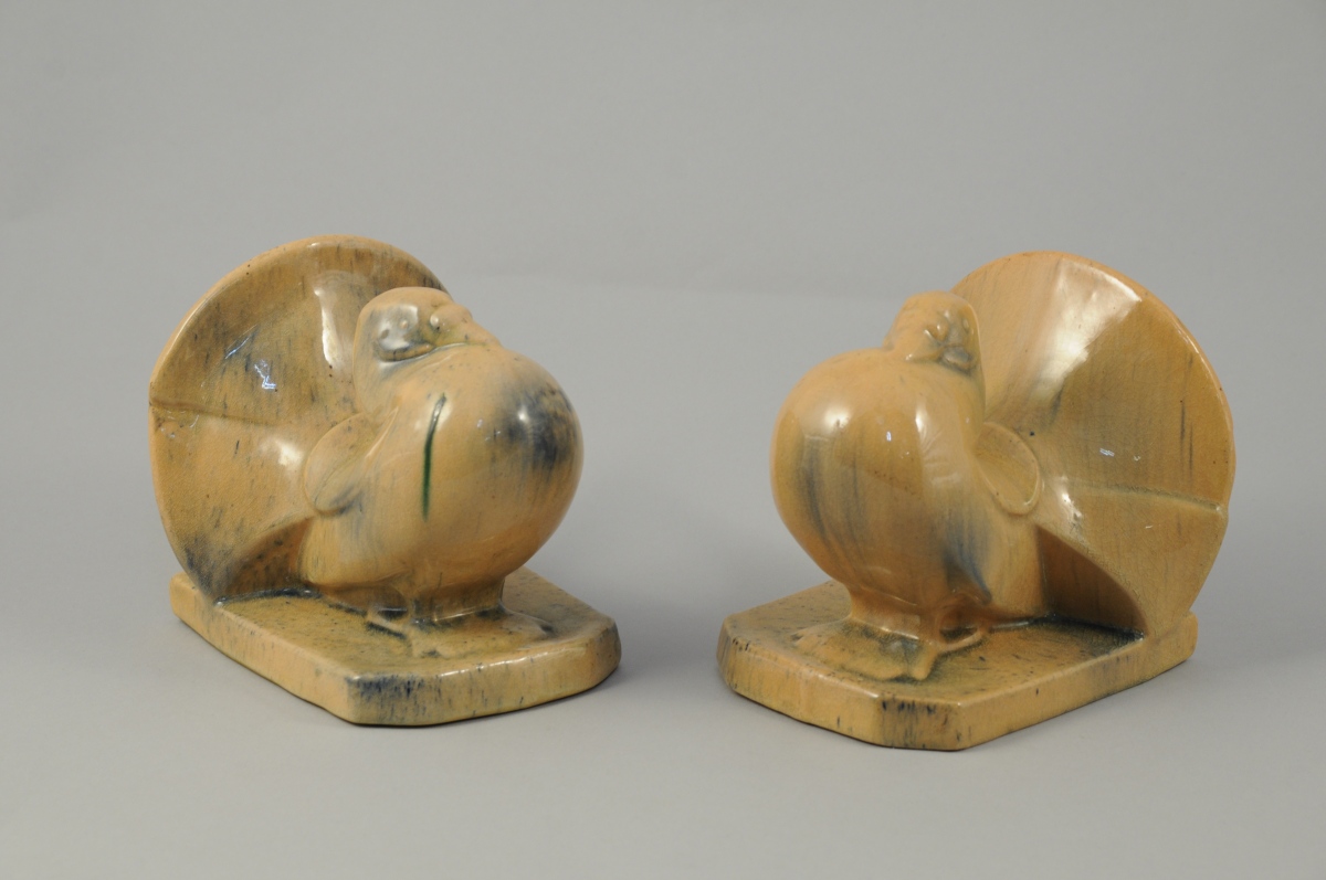 SERRE-LIVRES en faïence émaillée beige orangée représentant deux pigeons se rengorgeant. Style Art Déco. Circa 1930. Haut. 14,8, Long. 17, Larg. 12,2 cm.