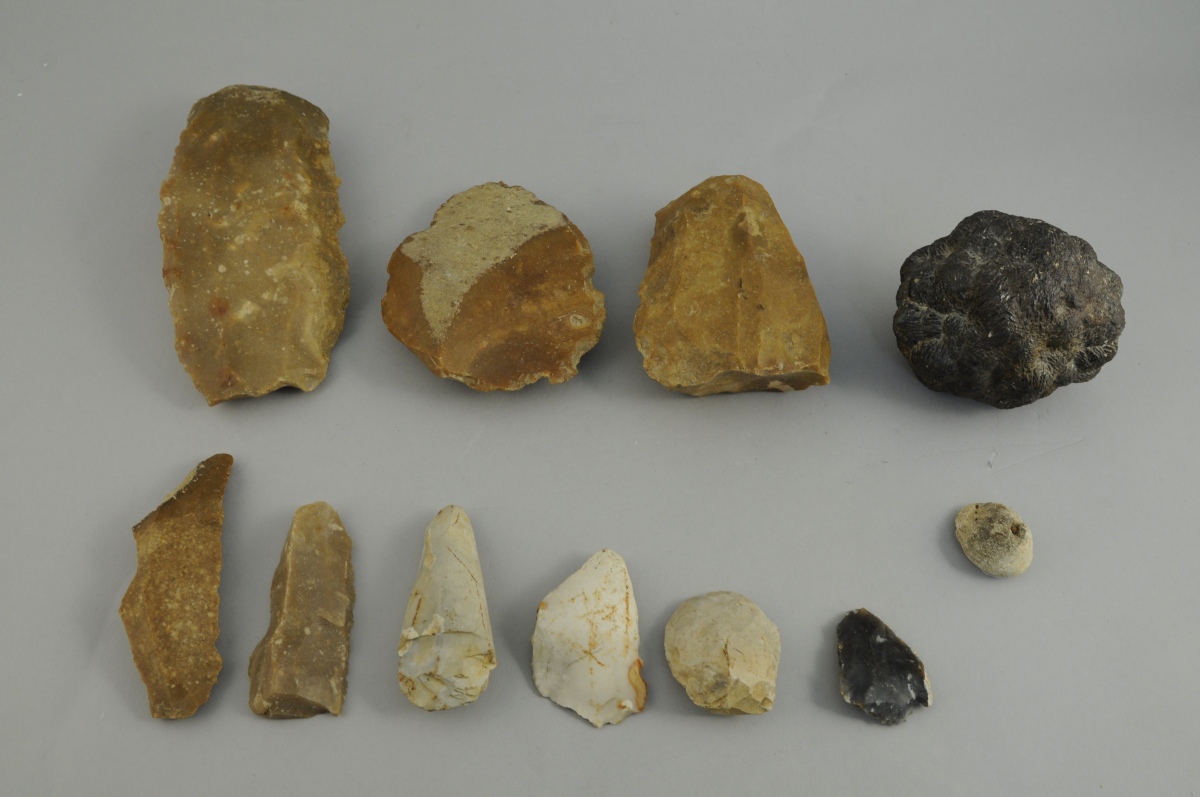 - Trois racloirs. Deux en silex blanc et un en silex noir. Long. 6, Larg. 4,5 ; Long. 6,7, Larg. 5,2 et Long.8,7, Larg. 5,2 cm.