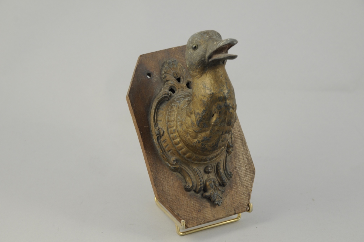 PATÈRE en bronze adoptant la forme d'une tête de canard sur un cartouche de style Louis XV. Le tout fixé sur un cartouche à pans coupés en bois naturel. XIXème. Long. 19,4, Larg. 11,2 cm.