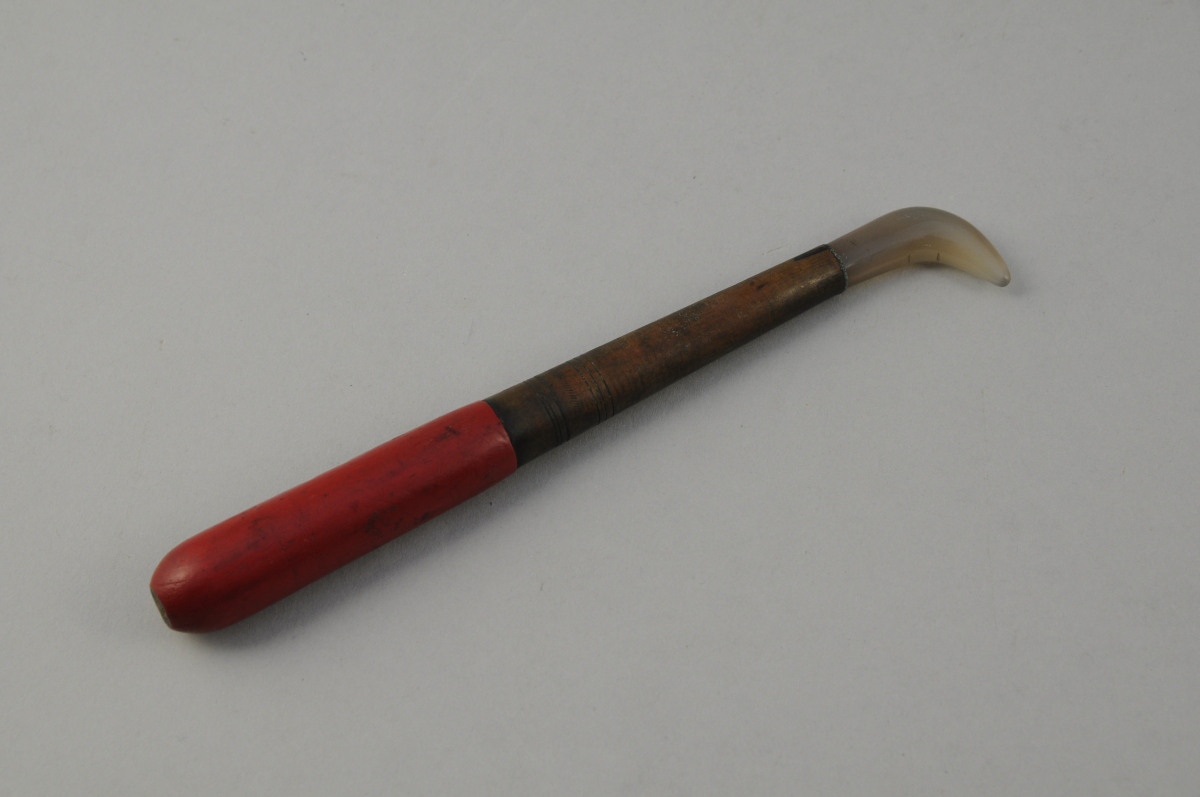 BRUNISSOIR en agathe. Manche en laiton et bois laqué rouge. Long. 20,7 cm.