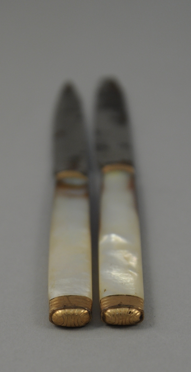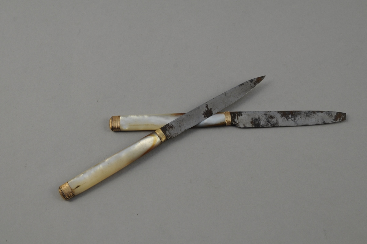 PAIRE de COUTEAUX, le manche en nacre bagué d'or et lame en métal. Long. 18,8 et 19 cm. Fin du XVIIème, début du XIXème. (manques et accidents, lames oxydées).