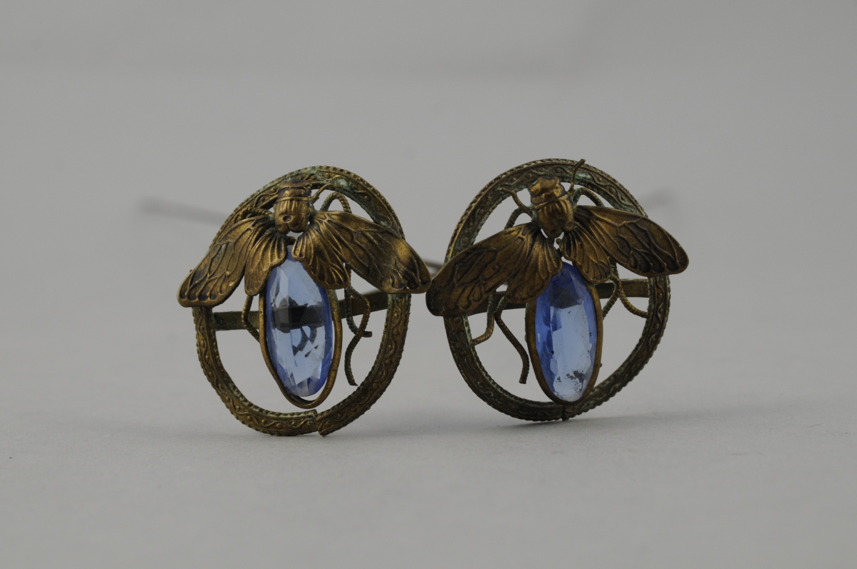 PAIRE D'ÉPINGLES À CHAPEAU, la monture de forme ovale en métal doré figurant une cigale, le corps serti de verre bleu facetté à l'imitation d'une pierre. Vers 1900. Haut. 30,6, Larg. 4 cm.