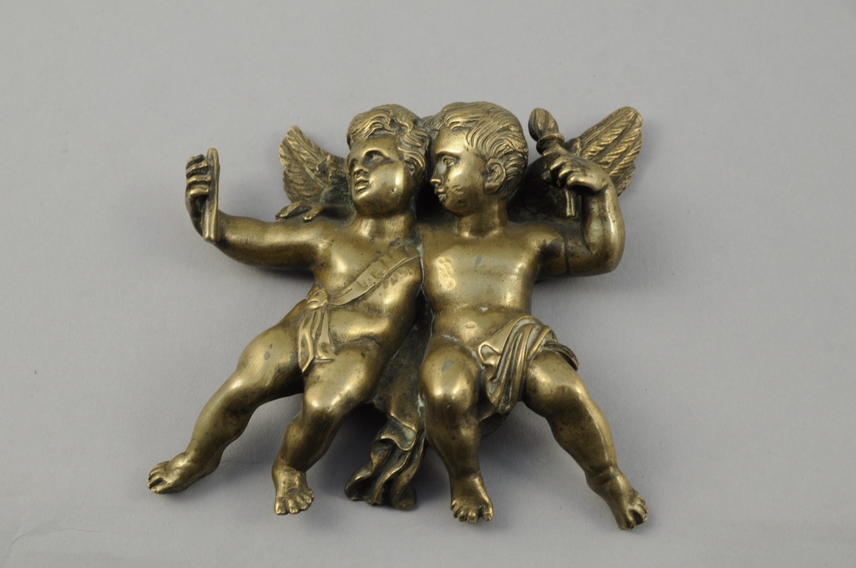 ORNEMENT en bronze ciselé figurant deux amours, l'un tenant un flambeau. XVIIIème. Haut. 11,1, Larg. 11,8 cm.