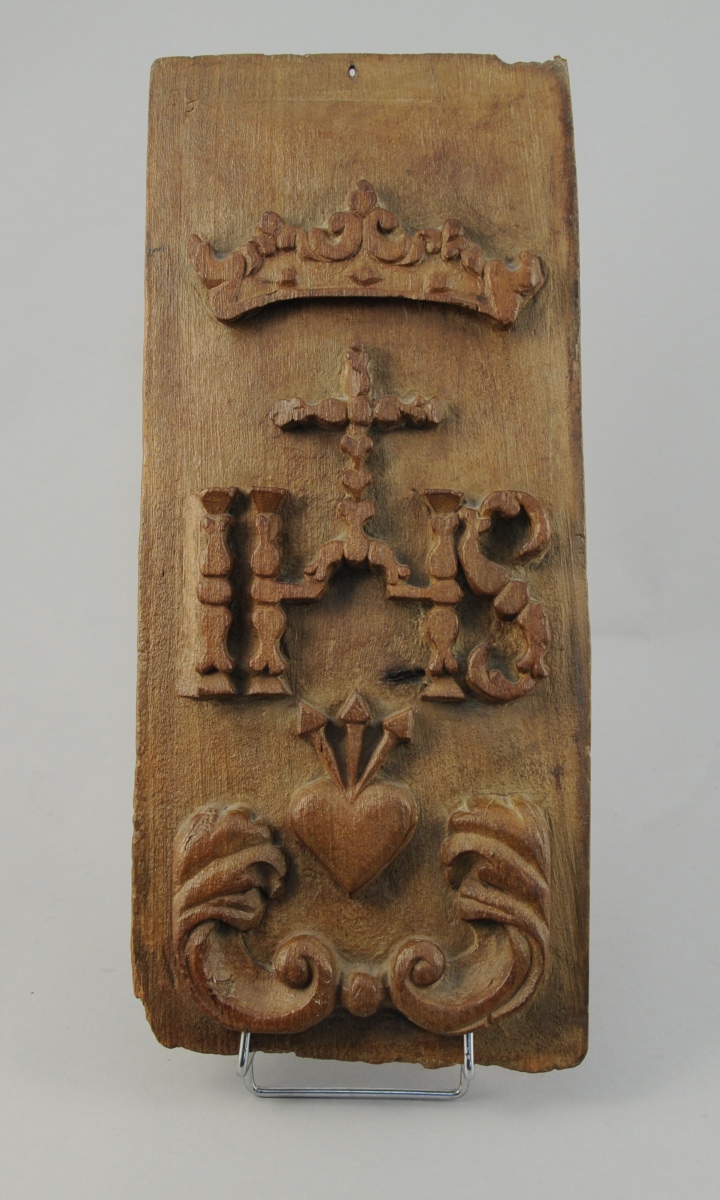 PANNEAU en noyer sculpté en bas-relief des lettres "IHS" couronnées et présentant, en partie inférieure, le Coeur Sacré planté des trois Clous souligné de deux volutes feuillagées. Travail ancien. Haut. 41,3, Larg. 18,1 cm.