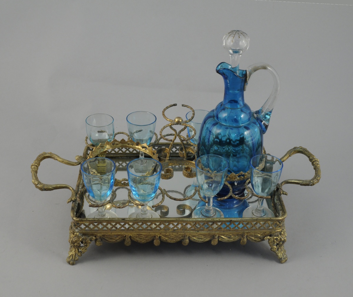 SERVICE à LIQUEUR composé d'une carafe en verre bleu à côtes torses, anse en verre blanc appliquée, bouchon et de sept verres en verre bleuté à pans coupés, le pied en verre blanc appliqué et un verre rapporté, le pied en verre jaune. Plateau foncé d'un miroir en laiton fondu et ciselé à décor de volutes feuillagées, frises de passementerie et cordons. Fin XIXème. Haut de l'ensemble. 27, Long. 38, Larg. 19 cm. (manques).