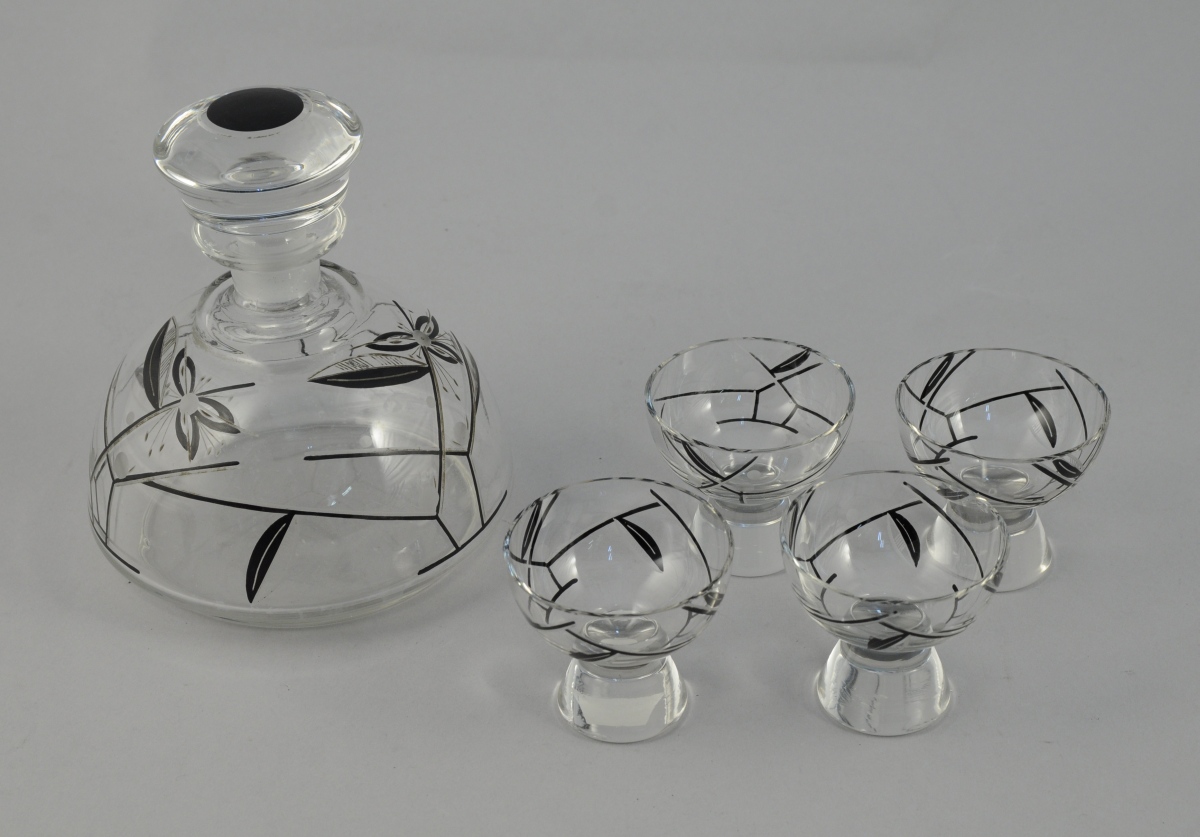 SERVICE à LIQUEUR composé d'une carafe et de quatre verres en cristal de Bohême taillé, satiné et teint en noir. La carafe et les verres à décor géométrisé de fleurs et feuillages, pastilles et filets. Le bouchon centré d'un rond noir et d'un filet satiné. Marque "TCHÉCOSLOVAQUIE". Haut. 12 et 6,5 cm. XXème. (usures et accidents)