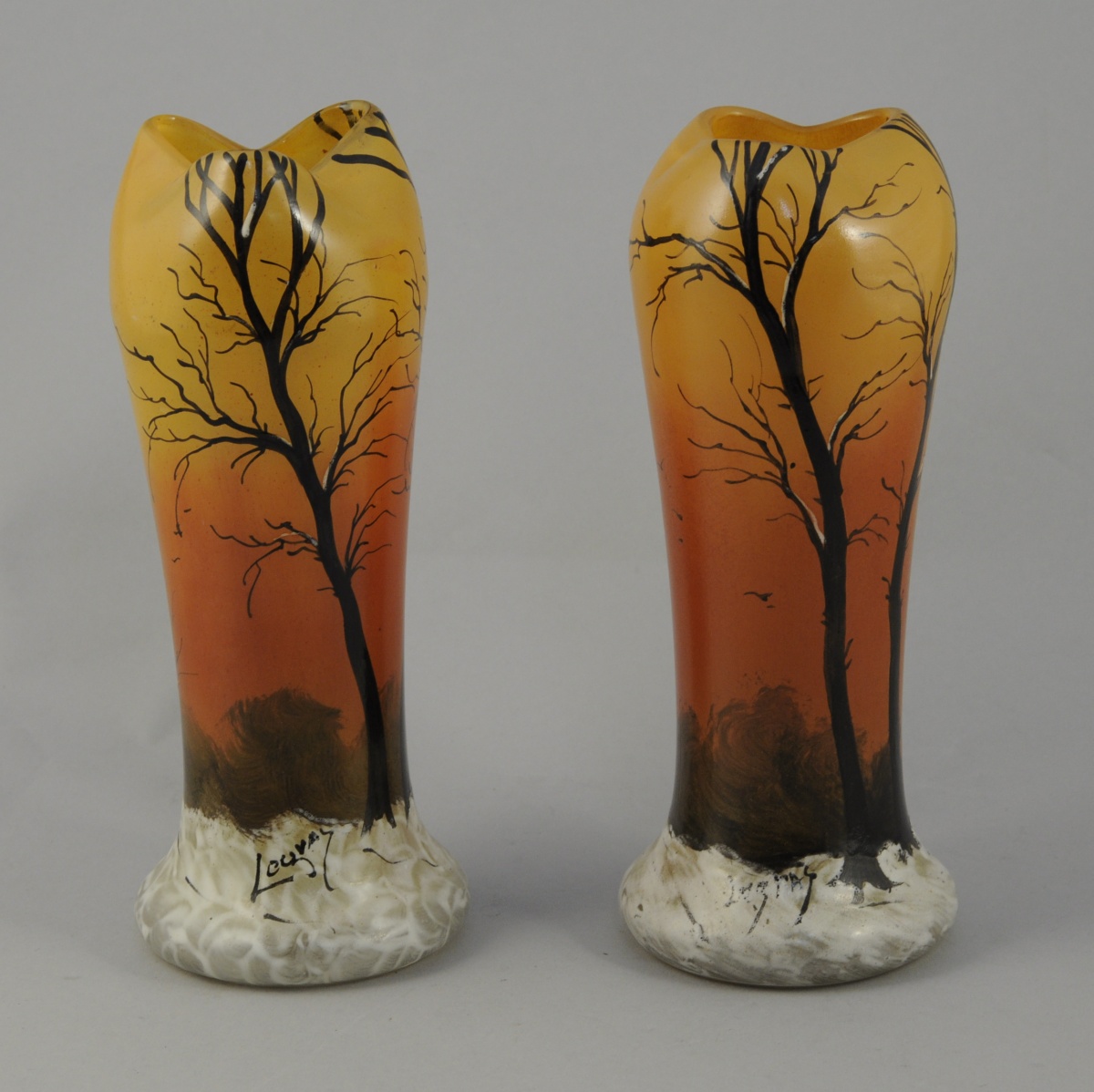 Paire de VASES en verre soufflé. Décor peint d'un paysage d'hiver sur fond orangé. Signés Louval (?). Début XXème. Haut. 27 cm.