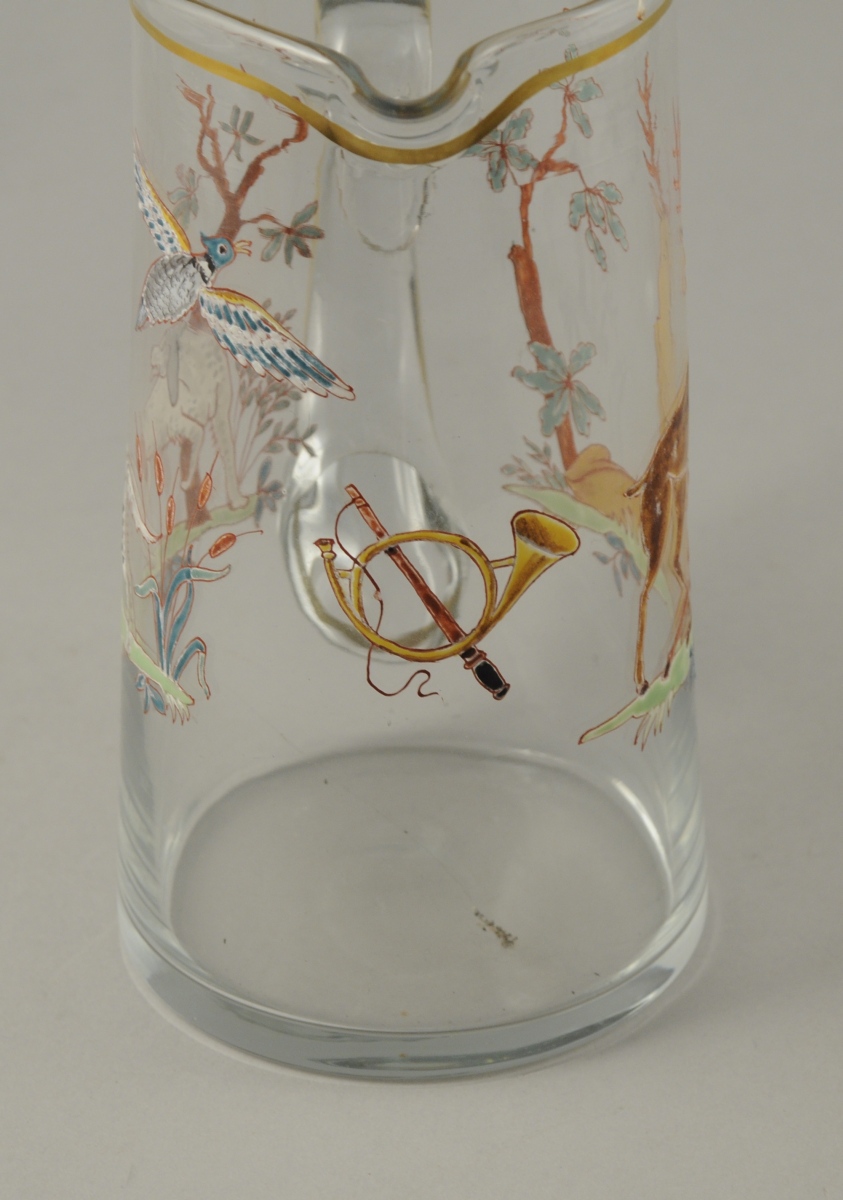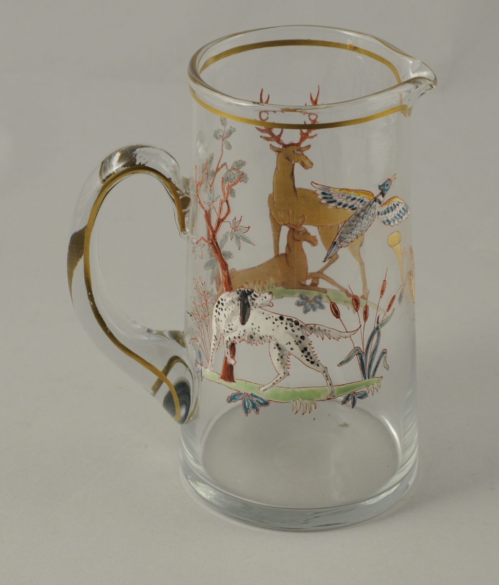 - Pichet tronconique en verre soufflé et anse appliquée. Décor polychrome peint d'un cerf et d'une biche sur un tertre d'un côté, d'un chien de chasse tacheté sur un tertre de l'autre, d'un cor de chasse et d'un colvert en vol. Filet or sur le col. XXème. Haut. 19,5 cm.