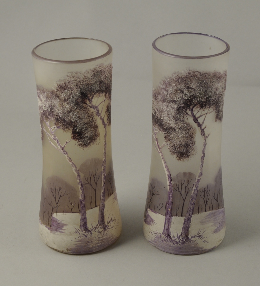 - Paire de vases élancés en verre opacifié. Décor en mauve, blanc et brun d'un paysage enneigé dans le goût des verreries Art Nouveau. Marqués au revers "1" et "5" Haut. 23 cm.