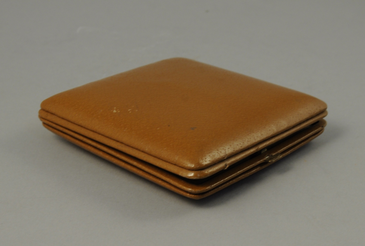 LANCEL. Pendule de voyage de forme carée avec calendrier intégré dans son étui en cuir. Vers 1950. Long. 14, Larg. 12,5 cm. (Accidents)