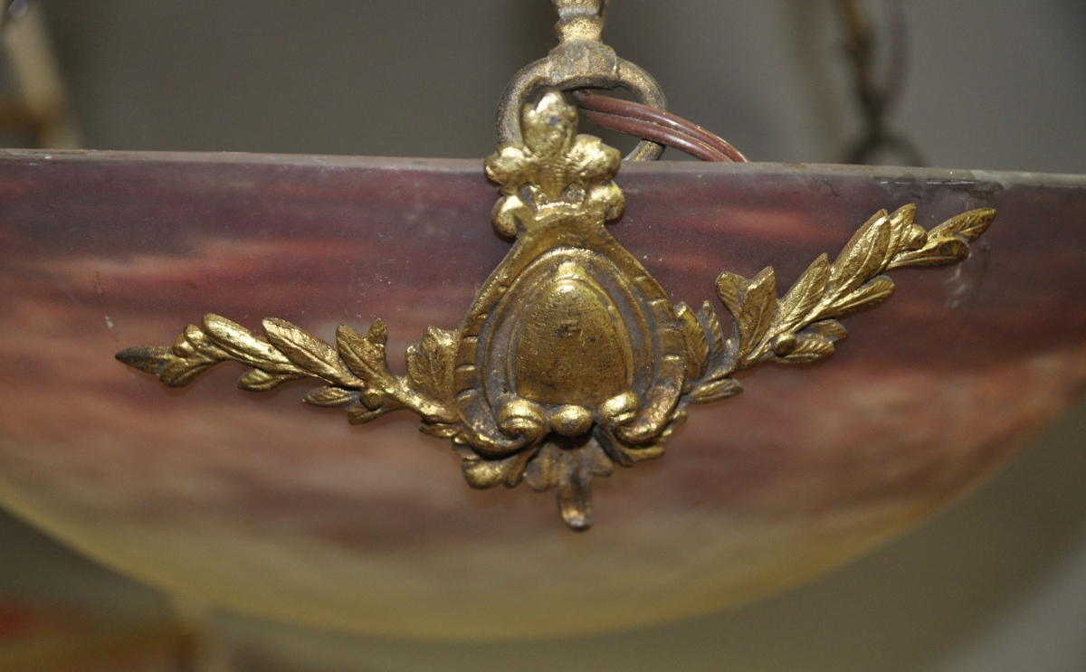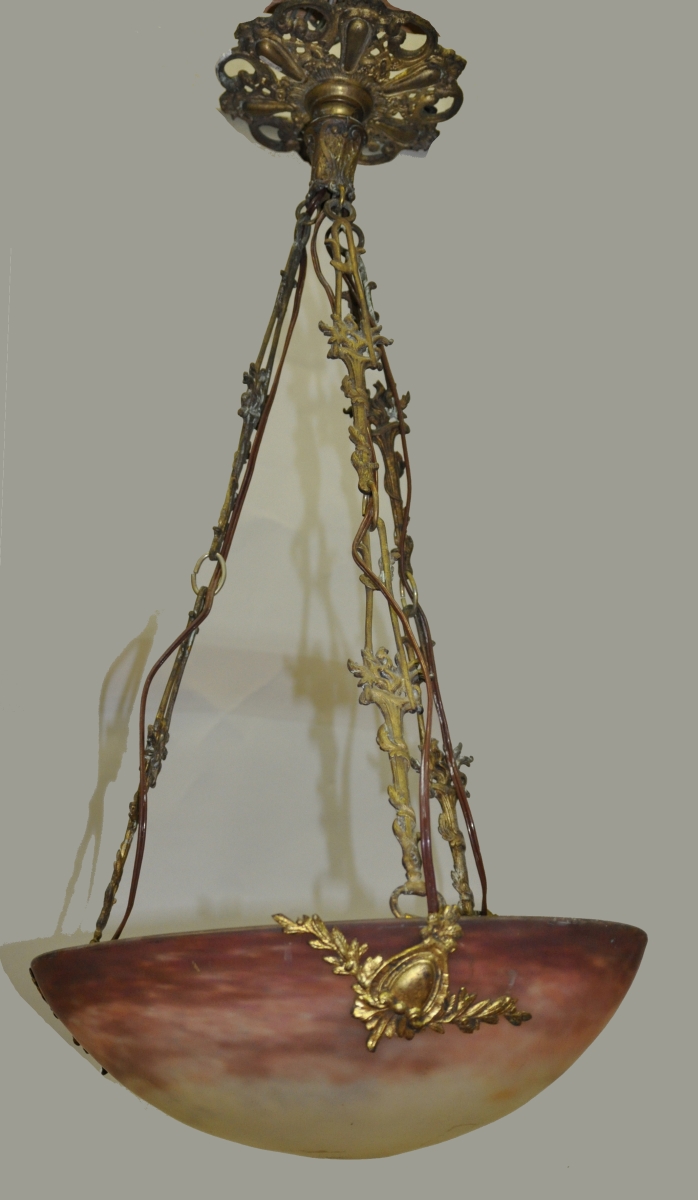 SUSPENSION formée d'une vasque en verre marmoréen teinté d'un dégradé de parme. Attaches et montures en métal doré à décor de cartouches feuillagés, flambeaux, agrafes et volutes. Signée. Vers 1900. Haut. 84,5, Diam. 40 cm.
