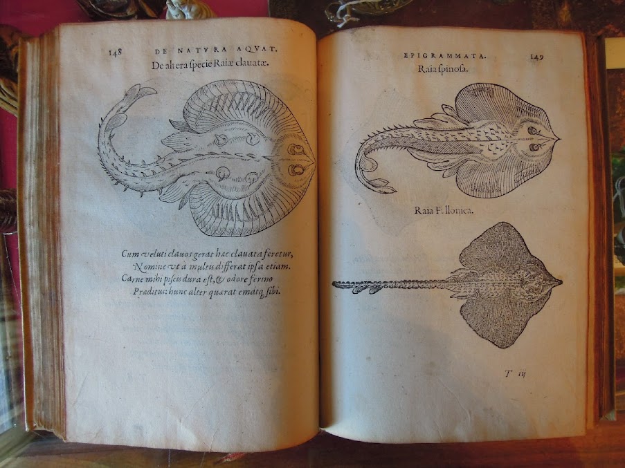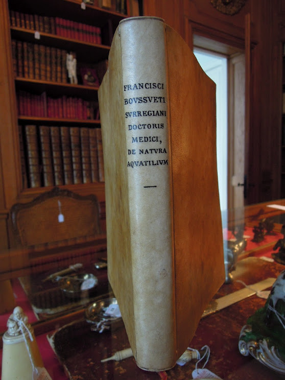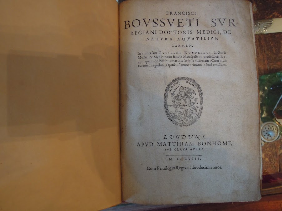 RONDELET. De Natura Aquatilium Carmen. Lyon, Bonhomme, 1558. petit in-4 pl.vélin moderne, titre manuscrit au dos. Nombreuses figures de poissons gravées sur bois dans le texte. Édition originale latine. Mouillure claire, sinon bel exemplaire. Non collationné.