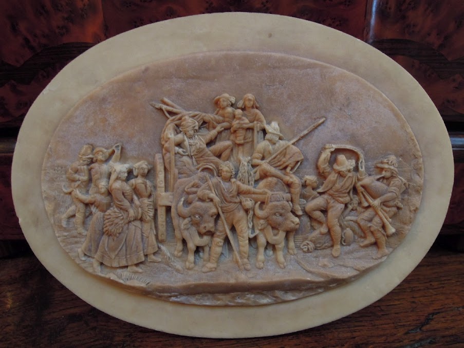 FÊTE DES MOISSONS. Plaque ovale en pierre de savon sculptée en bas-relief.