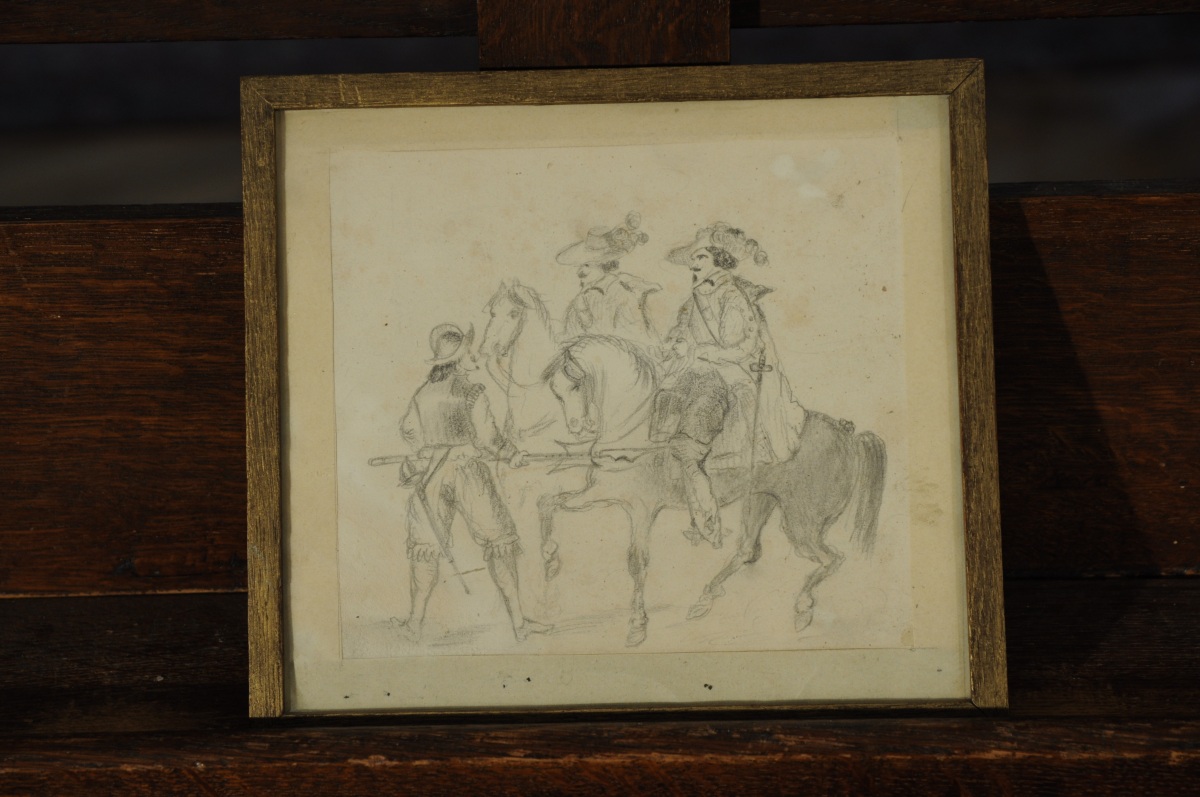 École FRANÇAISE du XIXème siècle.Mousquetaire à cheval.Crayon noir.15,5 x 16,5...