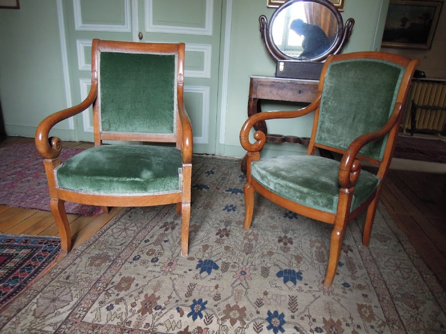 Paire de FAUTEUILS en noyer blond à crosses enroulées reposant sur des pieds antérieurs en jarret et postérieurs sabre.