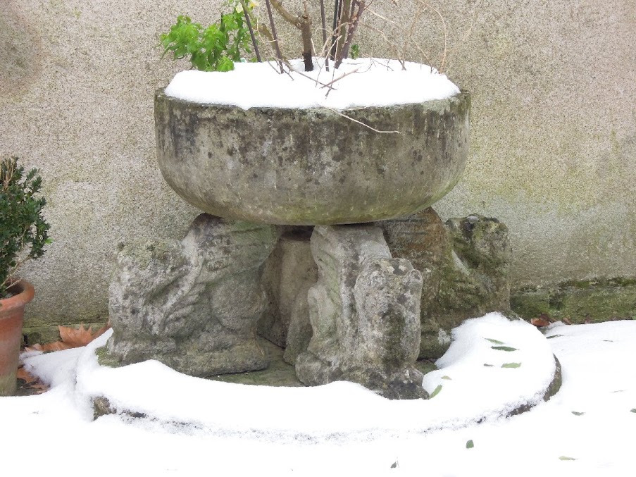 ORNEMENT DE JARDIN : pots, auges, bassin reposant sur quatre lions ailés en pierre.