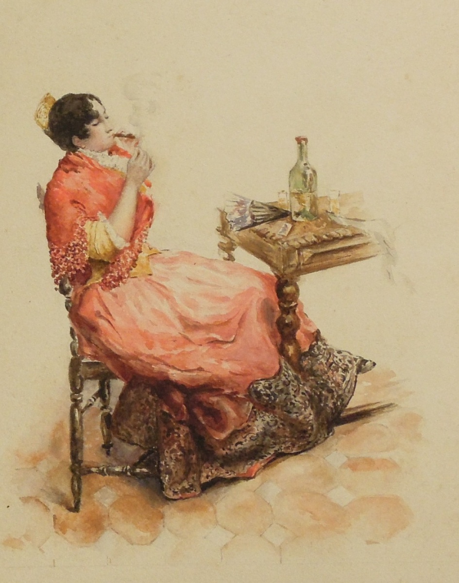 Danseuse de Flamenco fumant. Aquarelle. 24,5 x 18,5 cm.