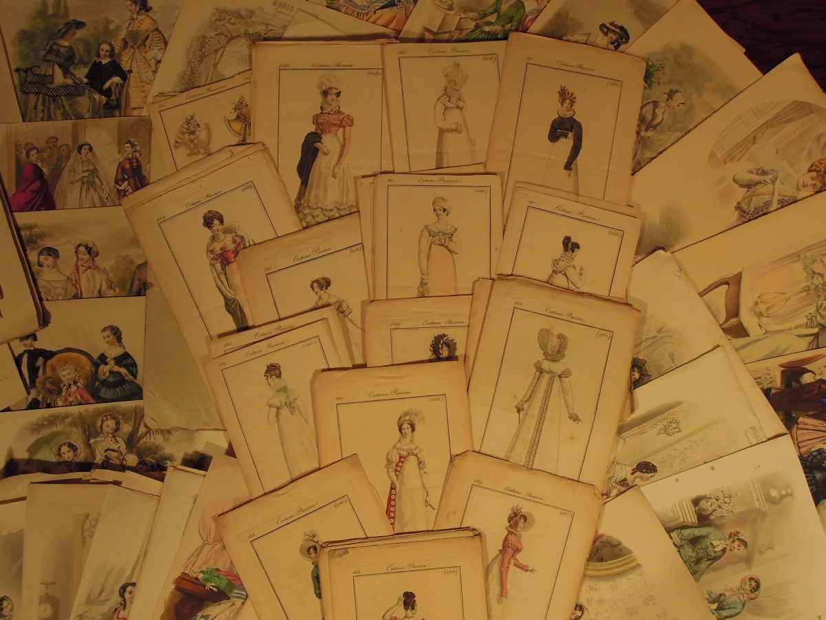 GRAVURES DE MODE. Trois cartons annotés 1846, 1847 et costumes de marié contenant plusieurs dizaines de gravures de mode rehaussées en couleur. Formats divers.