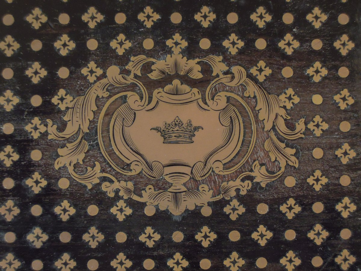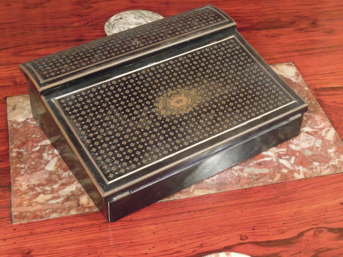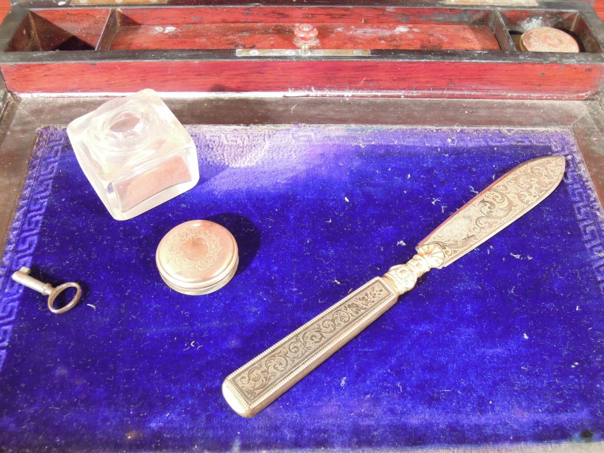 ÉCRITOIRE en palissandre, placage d'ébène et marqueterie de laiton ornée d'une couronne de Marquis ouvrant à deux abattants, la serrure marquée TAHAN À PARIS, avec ses deux godets en verre et leur couvercle de cuivre.