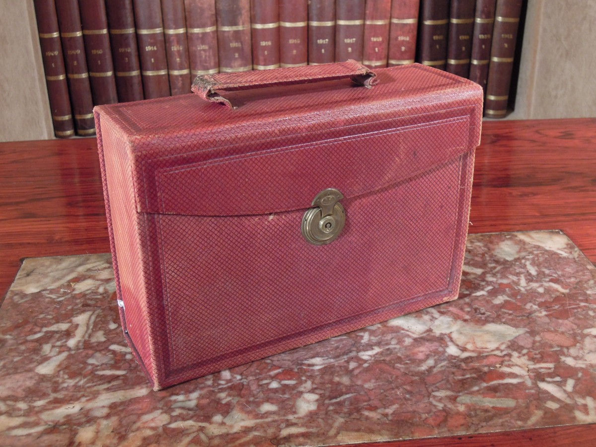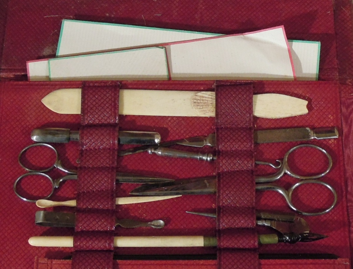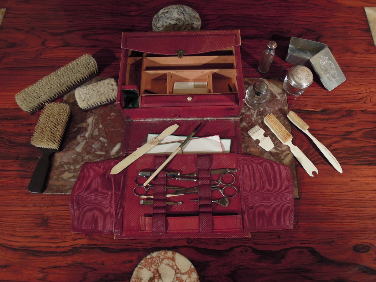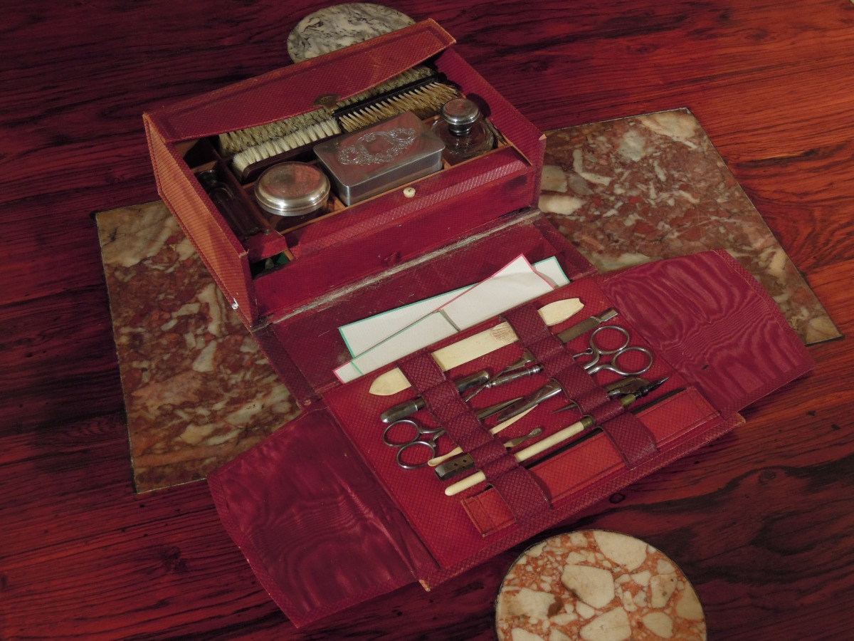 NÉCESSAIRE DE VOYAGE dans une valisette en cuir et carton bouilli comprenant : trois BROSSES en soie et bois exotique, trois FLACONS en verre et métal argenté, une BOITE en métal argenté, trois BROSSES, un PEIGNE, un COUPE-PAPIER, une ÉPINGLE et un PORTE-MINE en ivoire, un GODET et divers petits accessoires. Serrure monogrammée O.E. Paris.