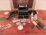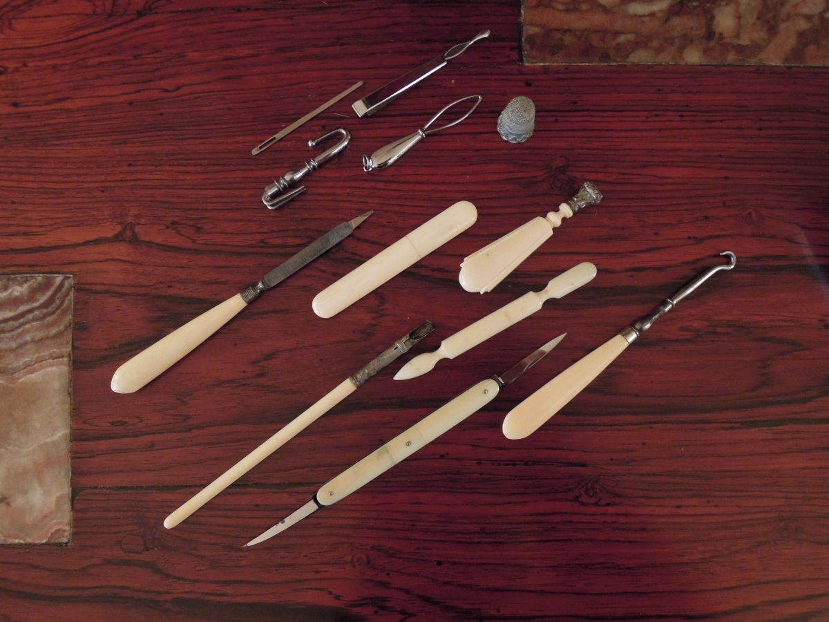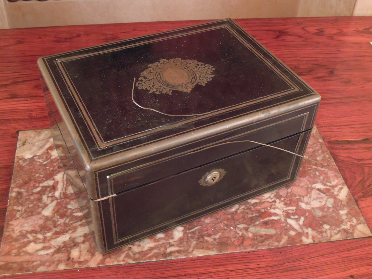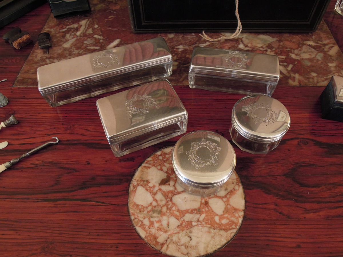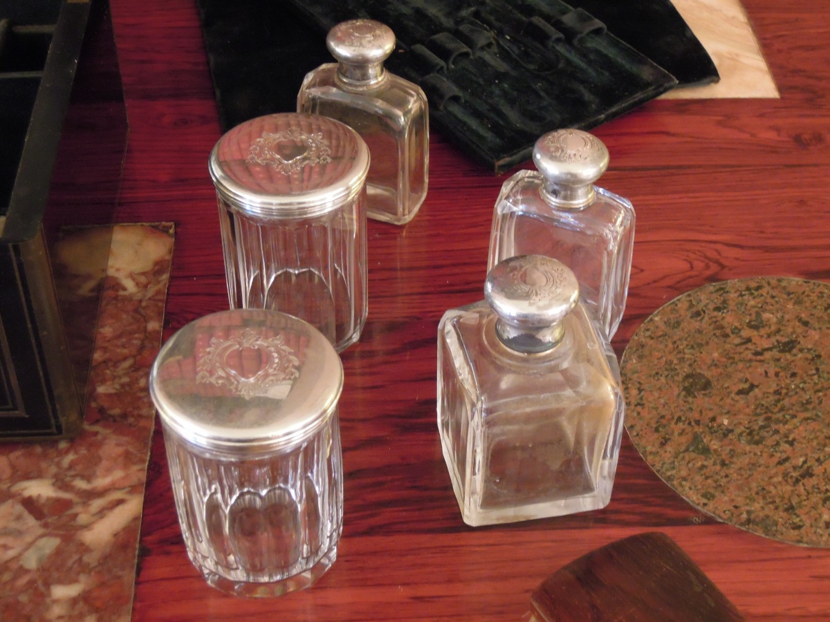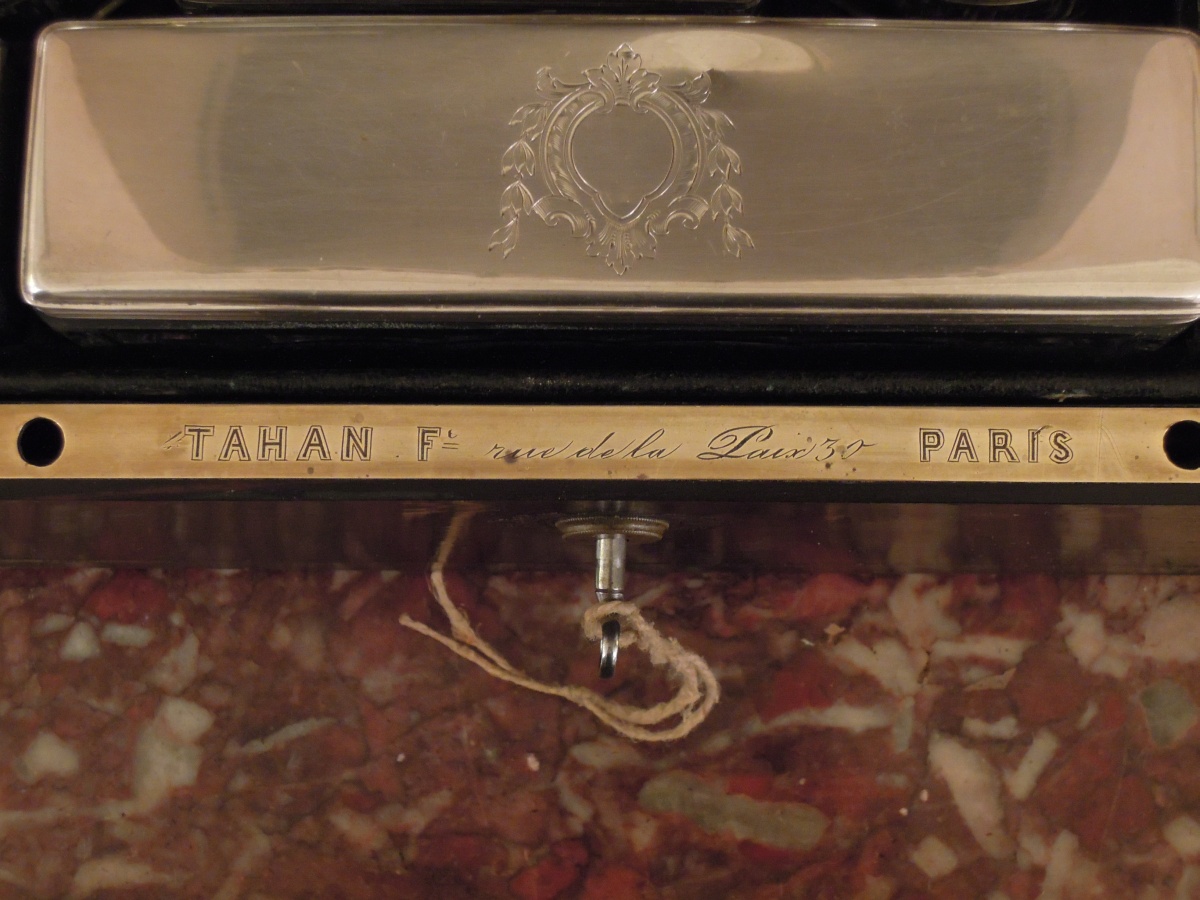 NÉCESSAIRE DE TOILETTE dans un coffret en placage d'ébène et filet de cuivre ouvrant par un couvercle monogrammée P.P à la couronne comtale, à trois niveaux d'accessoires. L'intérieur de l'abattant foncé d'un miroir dans un étui de cuir foncé. Le niveau supérieur comprend : onze boites et flacons en verre et métal argenté. Le niveau médian foncé d'un velours vert comprend : onze accessoires de toilettes, d'écriture ou de couture en ivoire, acier et métal argenté. Le niveau inférieur recueille sept étuis de cuir pour des brosses et divers accessoires. La serrure est signée " TAHAN F, rue de la Paix 30 PARIS ".