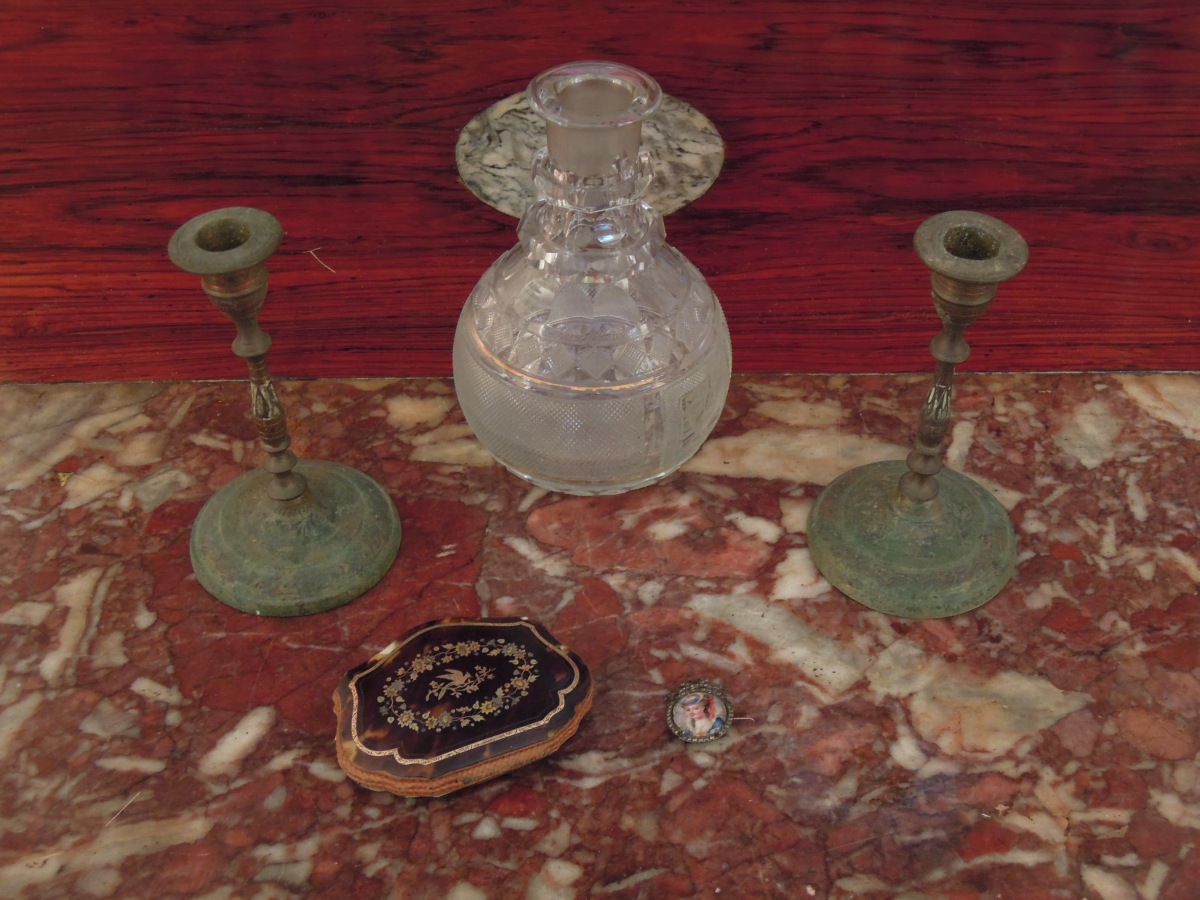 BOUTEILLE À COL en cristal, le corps guilloché et monogrammé F. P., la base étoilée. Haut. 13,5 cm.