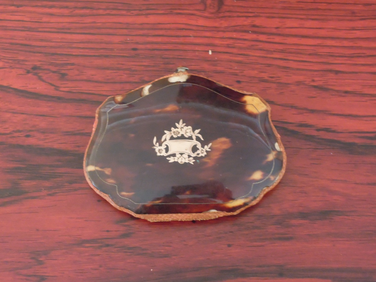 PORTE-BILLETS en écaille marqueté en or ( ?) jaune, blanc et rose de fleurs et oiseau. L'intérieur ouvrant à trois soufflets de soie rose. Larg. 7,5 cm (accidents, manques).