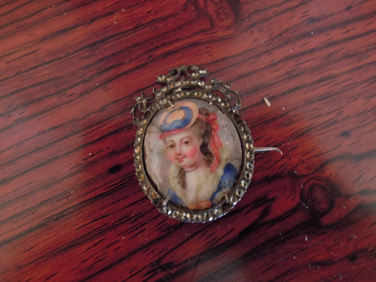 MINIATURE monté en broche figurant une jeune femme. Haut. 2,5 cm.