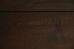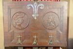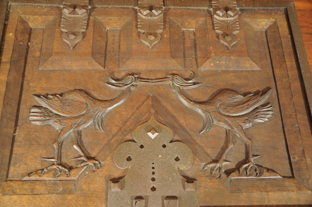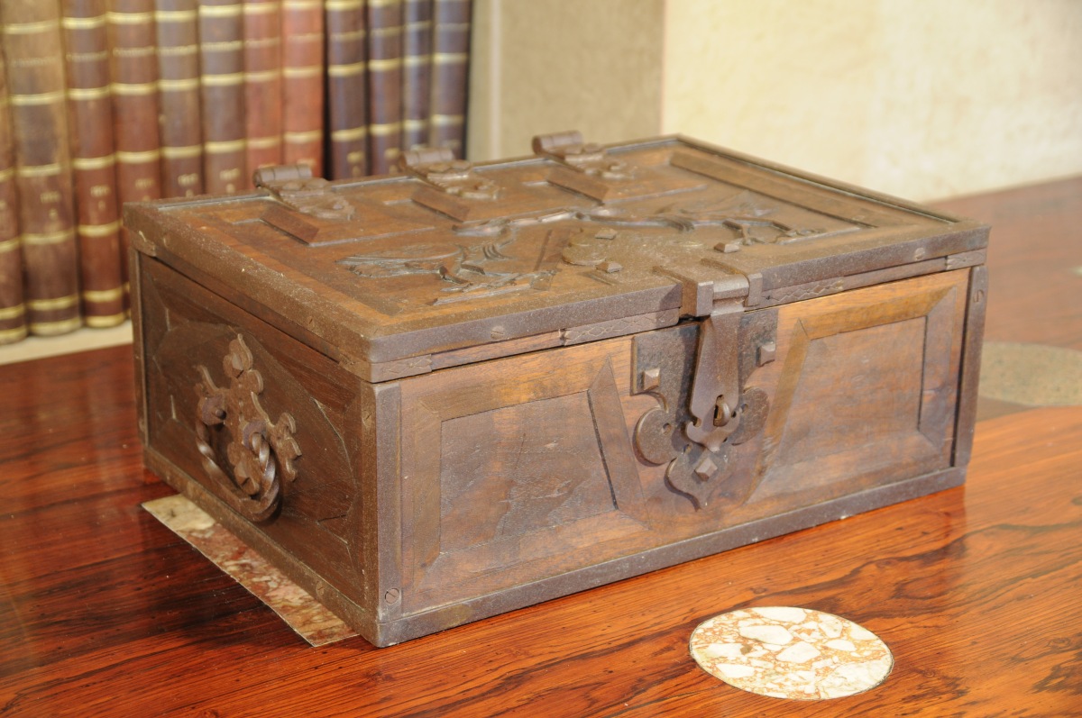 COFFRE en bois sculpté et pentures et poignées en fer forgé fleur-de-lysées et aux hermines. Le dessus de l'abatant est sculpté en bas-relief de grues asiatiques et l'intérieur des portraits de Louis XII et d'Anne de Bretagne d'après le double portrait de Louis XII et de Renée de France (Atelier Franco-Lombard du milieu du XVIème) légué par la Vicomtesse Marguerite de Poncins au musée Condé de Chantilly (n°573). Estampillé à l'intérieur E DE PONCINS 1916. Haut. 19,5, Larg. 50, Prof. 35,5 cm.