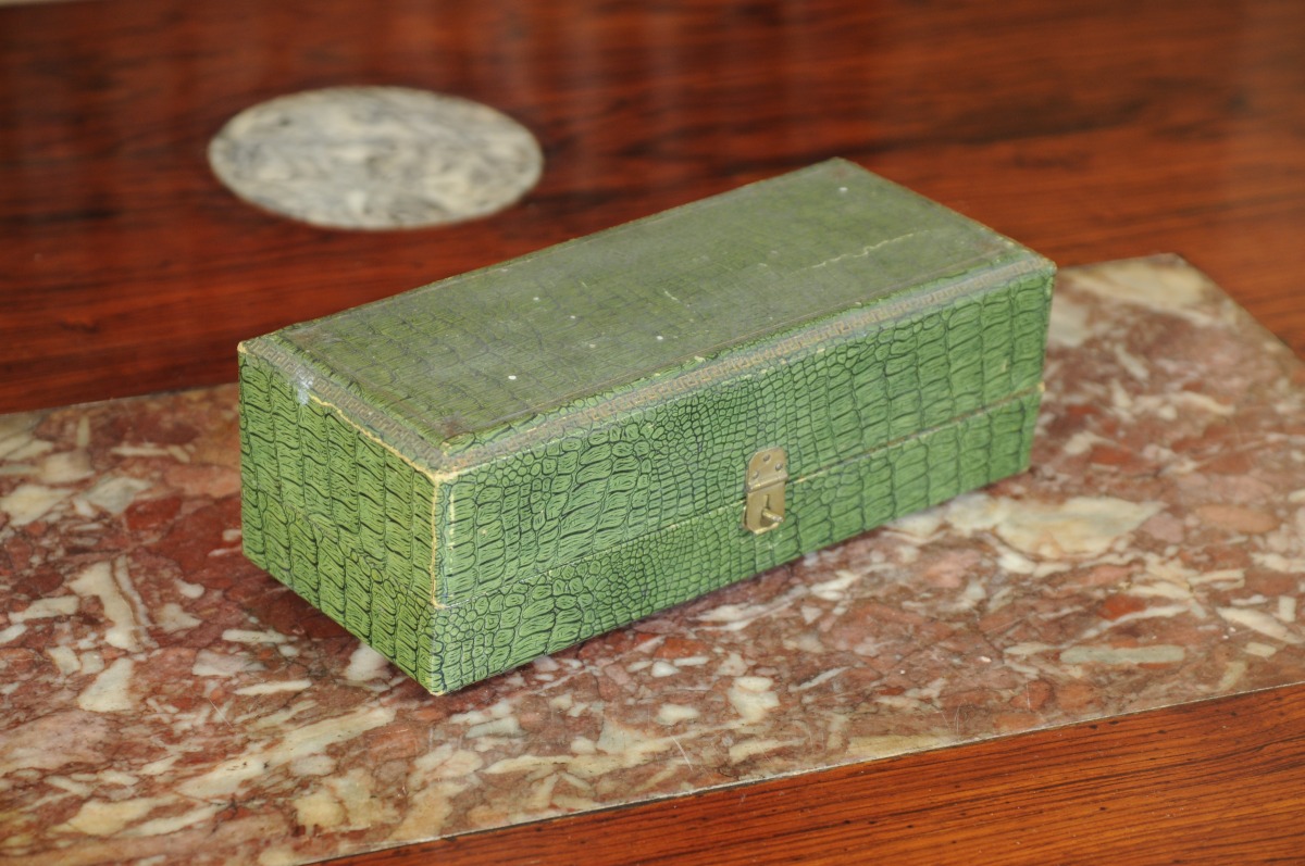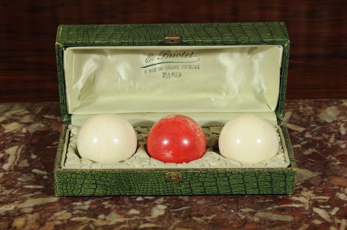 Trois BOULES DE BILLARD FRANÇAIS, en ivoire, deux blanches, une rouge, dans un étui en carton marqué " E. Briotet 8 rue du grand Prieuré Paris ". Diam. 5,5 cm.